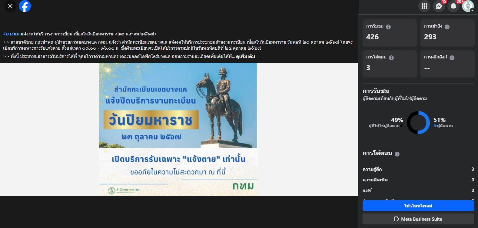 | 11-12-2024 | 429.00 |  | จำนวนการมีส่วนร่วมกับสื่อประชาสัมพันธ์ เรื่อง บางแค แจ้งงดให้บริการงานทะเบียน เนื่องในวันปิยมหาราช <23 ตุลาคม 2567> ที่เผยแพร่ (Engagement) ผ่านช่องทาง Facebook สำนักงานเขตบางแค เมื่อวันที่ 16 ตุลาคม 2567 = 429 | |