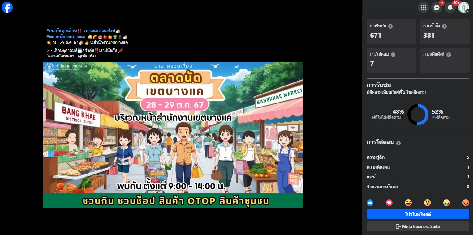 | 11-12-2024 | 678.00 |  | จำนวนการมีส่วนร่วมกับสื่อประชาสัมพันธ์ เรื่อง เดือนตุลาคมนี้ อย่าลืม เรามีนัดกัน "ตลาดนัดเขตบางแค" แหล่งช้อป ชิม ชิล หน้าสำนักงานเขต ที่เผยแพร่ (Engagement) ผ่านช่องทาง Facebook สำนักงานเขตบางแค เมื่อวันที่ 18 ตุลาคม 2567 = 678 | |