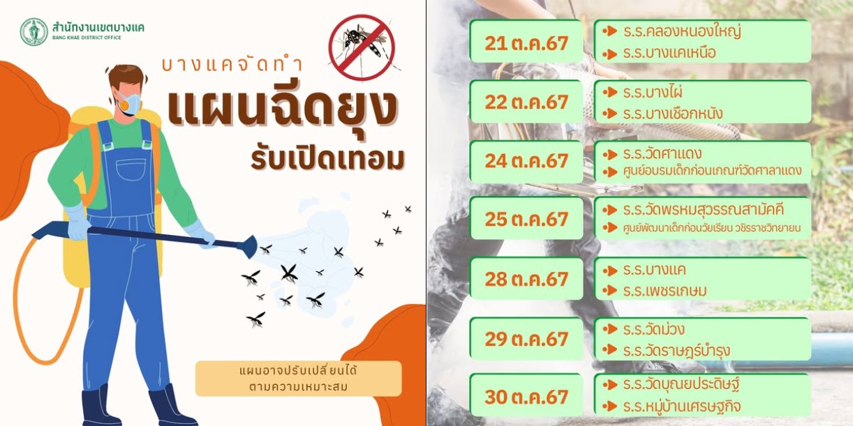 | 13-12-2024 | 1.00 |  | สื่อประชาสัมพันธ์ เรื่อง บางแค เตรียมพร้อมรับเปิดเทอม จัดทำแผนฉีดพ่นยุงป้องกันโรคไข้เลือดออก ที่เผยแพร่ ผ่านช่องทาง Facebook สำนักงานเขตบางแค เมื่อวันที่ 21 ตุลาคม 2567 | |
