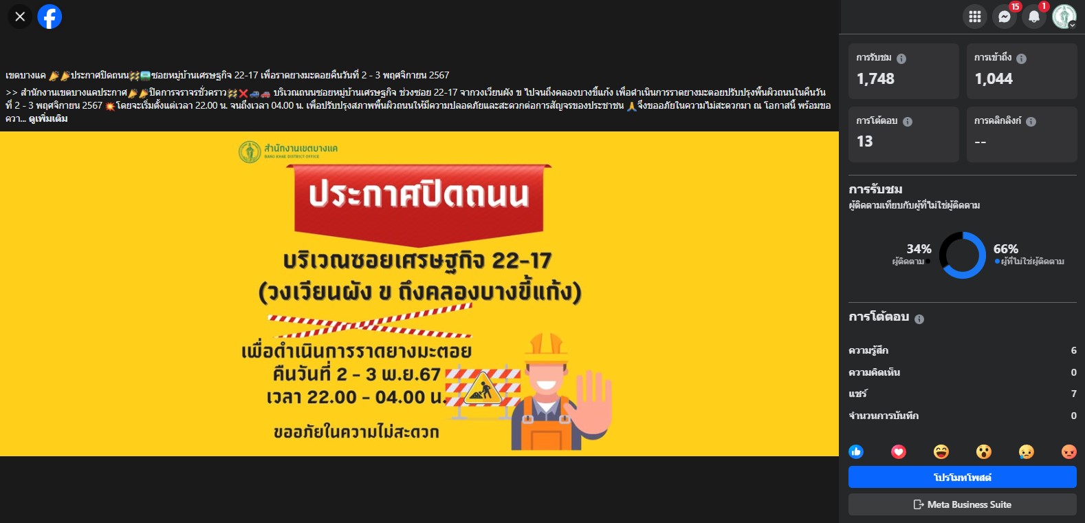 | 13-12-2024 | 1,761.00 |  | จำนวนการมีส่วนร่วมกับสื่อประชาสัมพันธ์ เรื่อง ประกาศปิดถนน ซอยหมู่บ้านเศรษฐกิจ 22-17 เพื่อราดยางมะตอยคืนวันที่ 2-3 พฤศจิกายน 2567 ที่เผยแพร่ (Engagement) ผ่านช่องทาง Facebook สำนักงานเขตบางแค เมื่อวันที่ 2 พฤศจิกายน 2567 = 1761 | |