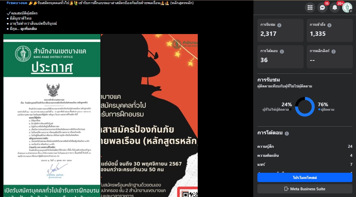 | 11-12-2024 | 2,353.00 |  | จำนวนการมีส่วนร่วมกับสื่อประชาสัมพันธ์ เรื่อง บางแค รับสมัครบุคคลทั่วไป เข้ารับการฝึกอบรมอาสาสมัครป้องกันภัยฝ่ายพลเรือน(หลักสูตรหลัก) ที่เผยแพร่ (Engagement) ผ่านช่องทาง Facebook สำนักงานเขตบางแค เมื่อวันที่ 4 ตุลาคม 2567 = 2353 | |