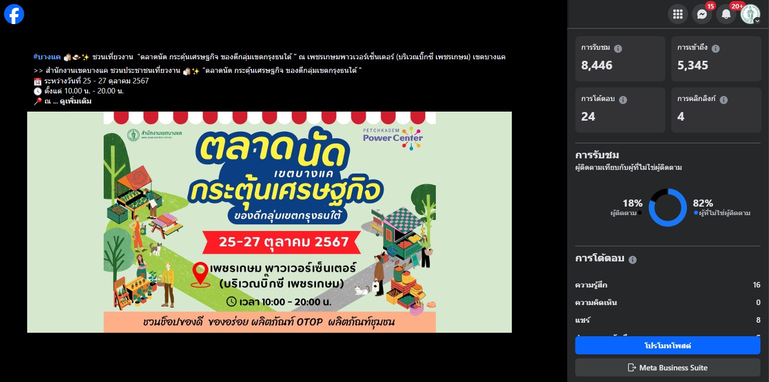 | 11-12-2024 | 8,470.00 |  | จำนวนการมีส่วนร่วมกับสื่อประชาสัมพันธ์ เรื่อง บางแคชวนเที่ยวงาน “ตลาดนัด กระตุ้นเศรษฐกิจ ของดีกลุ่มเขตกรุงธนใต้ " ณ เพชรเกษมพาวเวอร์เซ็นเตอร์ (บริเวณบิ๊กซี เพชรเกษม) เขตบางแค ที่เผยแพร่ (Engagement) ผ่านช่องทาง Facebook สำนักงานเขตบางแค เมื่อวันที่ 11 ตุลาคม 2567 = 8470 | |