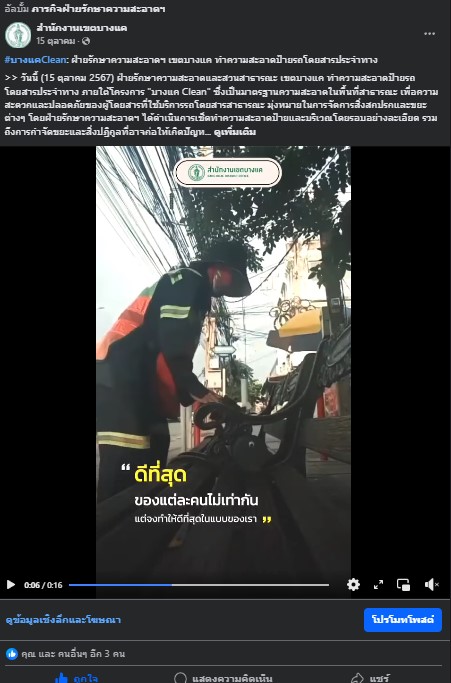 | 11-12-2024 | 1.00 |  | สื่อประชาสัมพันธ์ เรื่อง บางแค Clean ฝ่ายรักษาความสะอาดฯ เขตบางแค ทำความสะอาดป้ายรถโดยสารประจำทาง ที่เผยแพร่ ผ่านช่องทาง Facebook สำนักงานเขตบางแค เมื่อวันที่ 15 ตุลาคม 2567 | |