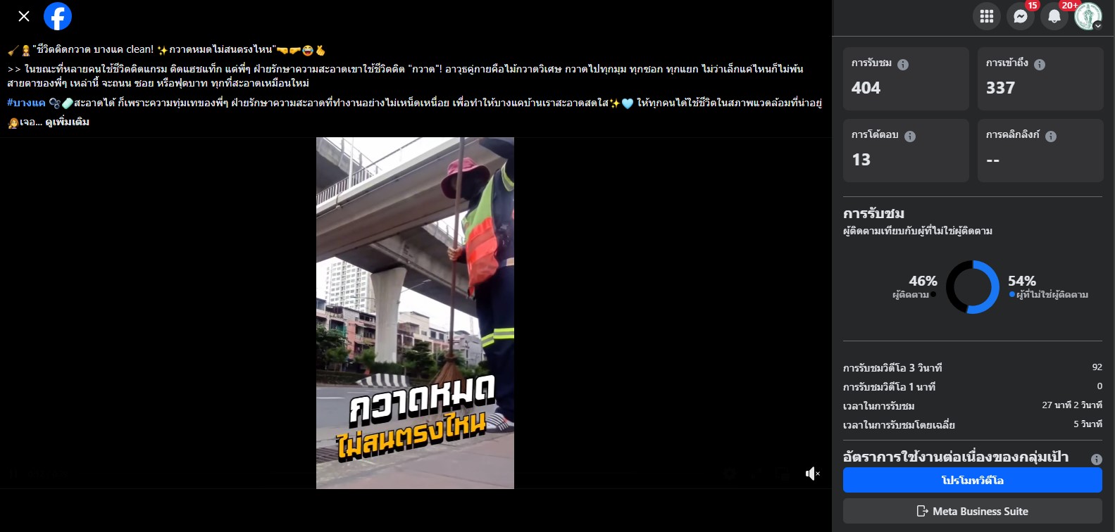 | 11-12-2024 | 417.00 |  | จำนวนการมีส่วนร่วมกับสื่อประชาสัมพันธ์ เรื่อง "ชีวิตติดกวาด บางแค clean!กวาดหมดไม่สนตรงไหน" ที่เผยแพร่ (Engagement) ผ่านช่องทาง Facebook สำนักงานเขตบางแค เมื่อวันที่ 18 ตุลาคม 2567 = 417 | |
