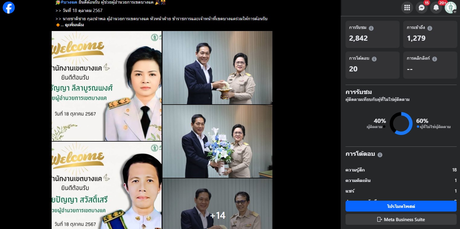 | 11-12-2024 | 2,862.00 |  | จำนวนการมีส่วนร่วมกับสื่อประชาสัมพันธ์ เรื่อง บางแค ยินดีต้อนรับ ผู้ช่วยผู้อำนวยการเขตบางแค ที่เผยแพร่ (Engagement) ผ่านช่องทาง Facebook สำนักงานเขตบางแค เมื่อวันที่ 18 ตุลาคม 2567 = 2862 | |