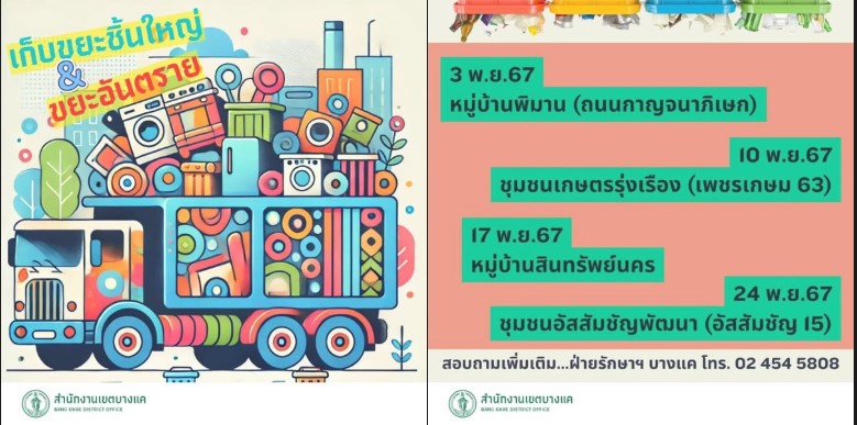| 13-12-2024 | 1.00 |  | สื่อประชาสัมพันธ์ เรื่อง บางแค นัดทิ้งนัดเก็บ แจ้งแผนเก็บขยะชิ้นใหญ่ & ขยะอันตราย ประจำเดือนพฤศจิกายน 2567 ที่เผยแพร่ ผ่านช่องทาง Facebook สำนักงานเขตบางแค เมื่อวันที่ 27 ตุลาคม 2567 | |