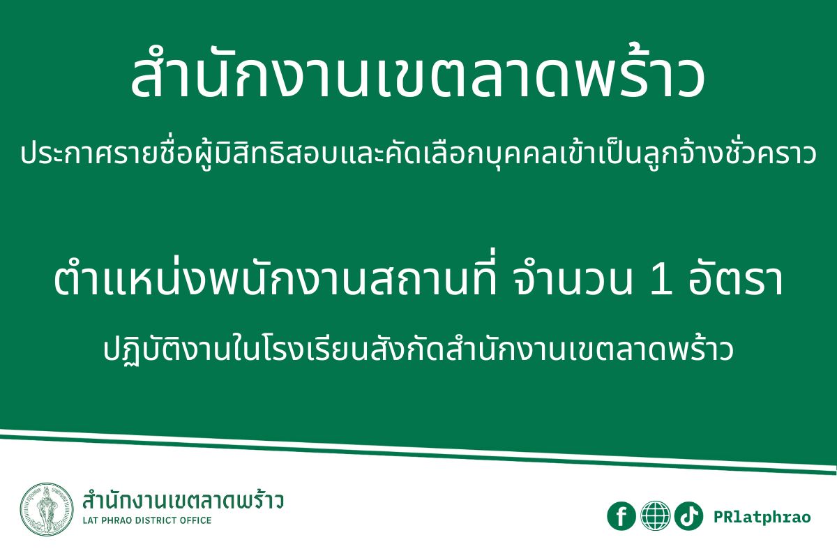 | 11-12-2024 | 1,166.00 |  | สำนักงานเขตลาดพร้าว ดำเนินการผลิตสื่อประชาสัมพันธ์ ประเภท อินโฟกราฟิก เรื่อง #เขตลาดพร้าว>>ประกาศรายชื่อผูัมีสิทธิสอบและคัดเลือกบุคคลเข้ารับราชการเป็นลูกจ้างชั่วคราว เผยแพร่ผ่าน Facebook เมื่อวันที่ 19 พฤศจิกายน 2567 มียอดการรับชม 813 ยอดการเข้าถึง 344 การโต้ตอบ 9 | |