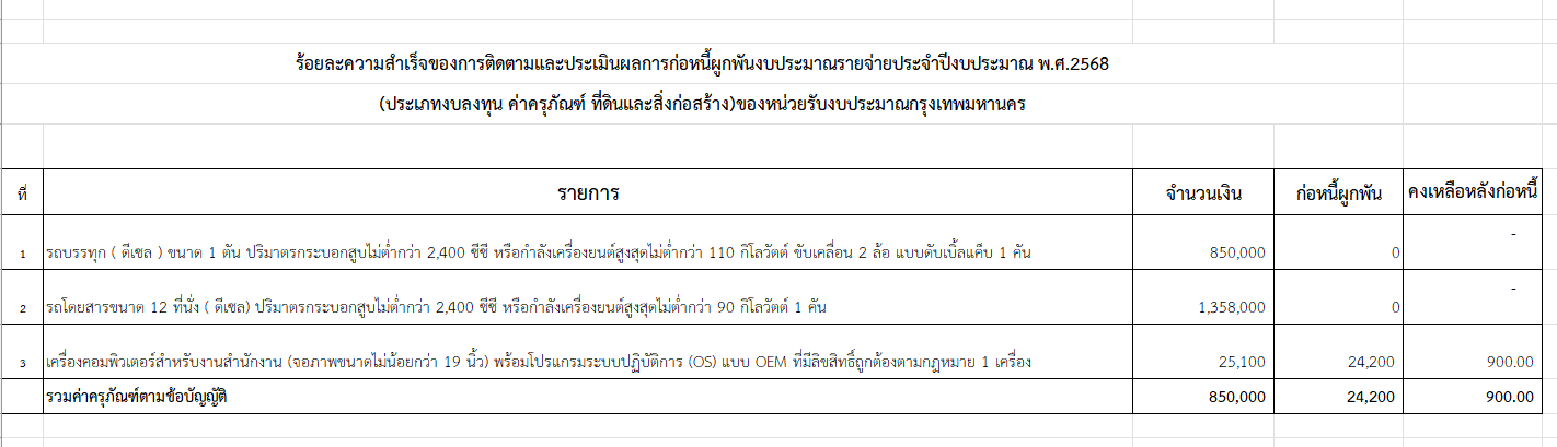 ![]() | - | ร้อยละความสำเร็จของการติดตามและประเมินผลการก่อหนี้ผูกพันงบประมาณรายจ่ายประจำปีงบประมาณ พ.ศ. 2568 (ประเภทงบลงทุน ค่าครุภัณฑ์ ที่ดินและสิ่งก่อสร้าง) ของหน่วยรับงบประมาณกรุงเทพมหานคร | ร้อยละ | 92.00 | 100.00 | 108.70 |