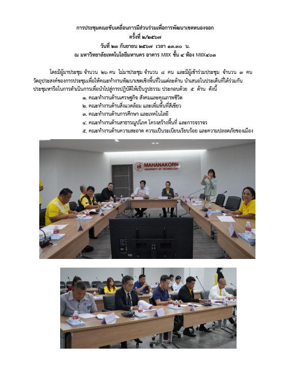 ![]() | 29-09-2025 | 1.00 | ![]() | เมื่อวันที่ 12 กันยายน 2567 คณะทำงานด้านสาธารณูปโภค โครงสร้างพื้นฐาน และการจราจร จัดประชุมเพื่อแลกเปลี่ยนความคิดเห็นในการแก้ไขปัญหาการจราจร ณ มหาวิทยาลัยเทคโนโลยีมหานคร เพื่อให้กรุงเทพมหานครดำเนินการแก้ไขต่อไป สรุปผลการประชุมดังนี้ | |