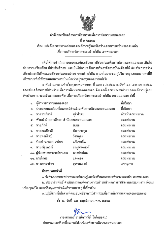 ![]() | 12-12-2024 | 0.00 | ![]() | ประธาน คคพ. เขตหนองจอก ได้มีคำสั่งคณะขับเคลื่อนการมีส่วนร่วมเพื่อการพัฒนาเขตหนองจอก ที่ 3/2567 ลงวันที่ 18 พฤศจิกายน 2567 เรื่อง แต่งตั้งคณะทำงานถ่ายทอดองค์ความรู้และจัดสร้างเตาเผาขยะชีวมวลลดมลพิษ เพื่อการบริหารจัดการขยะอย่างยั่งยืนเขตหนองจอก | |