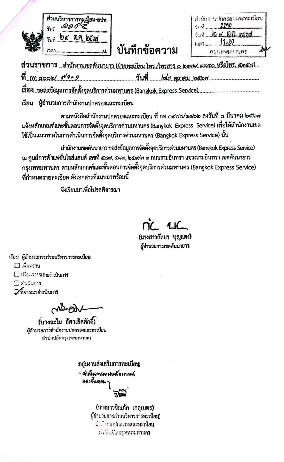 ![]() | 23-09-2025 | 0.00 | รายงานผลการดำเนินการตามตัวชี้วัดเจรจาตกลงการประเมินผลกการปฏิบัติราชการ ปีงบประมาณ พ.ศ.2568 ระดับความสำเร็จของจำนวนจุดบริการด่วนมหานคร (Bangkok Express Service) ที่เพิ่มขึ้น ให้ผู้บริหารกรุงเทพมหานครทราบเรียบร้อยแล้ว ตามหนังสือสำนักงานปกครองและทะเบียน ที่ กท 0406/4381 ลงวันที่ 1 กันยายน 2568 โดยสามารถเพิ่มจุดบริการด่วนมหานคร (Bangkok Express Service) ได้จำนวน 3 แห่ง ได้แก่ 1) สำนักงานเขตคันนายาว บริเวณชั้น B ศูนย์การค้าแฟชั่นไอส์แลนด์ 2) สำนักงานเขตทุ่งครุ บริเวณห้างสรรพสินค้าโลตัส สาขาประชาอุทิศ และ 3) สำนักงานเขตดินแดง บริเวณศูนย์การค้า เดอะ สตรีท รัชดา | ||
