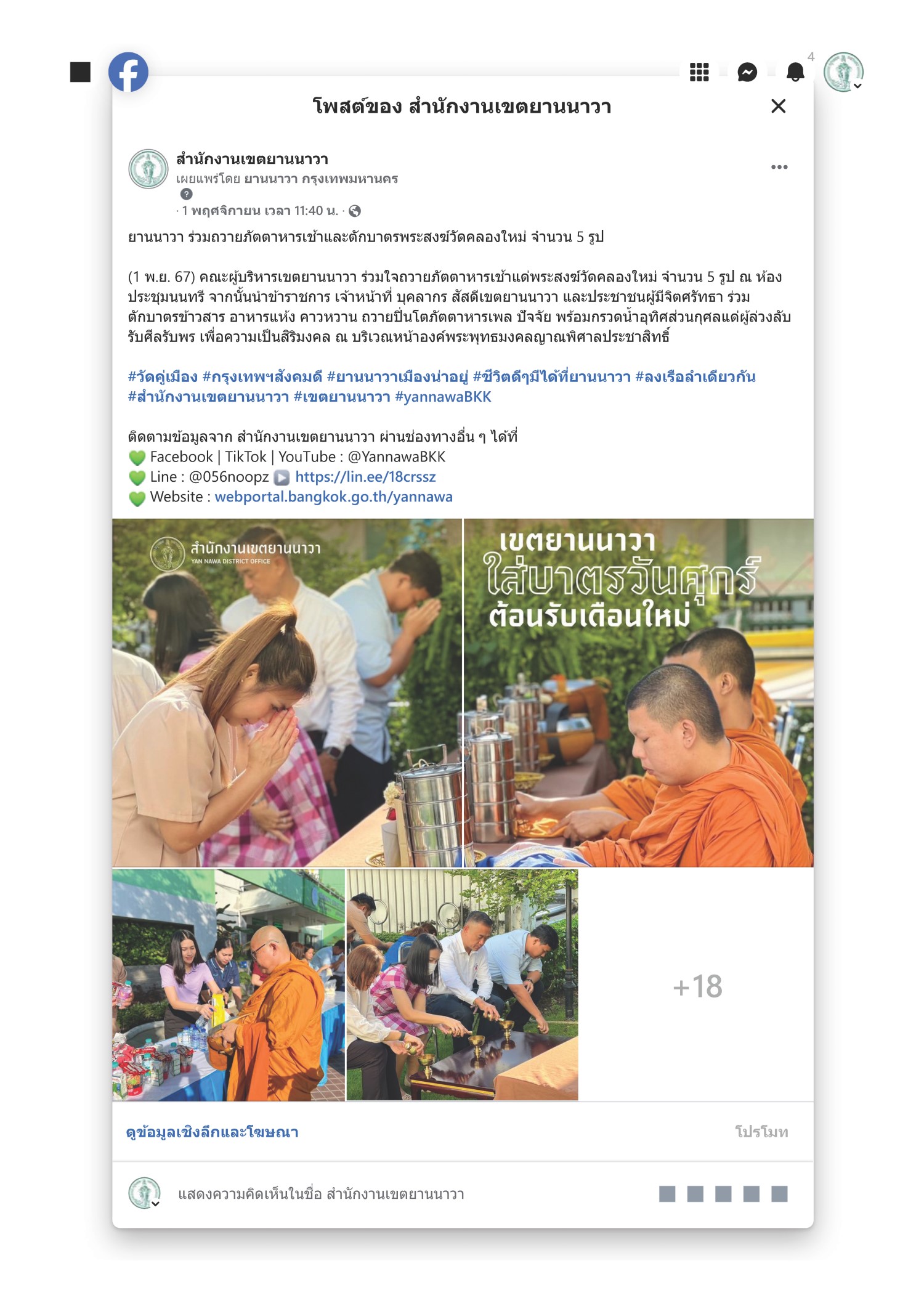 20-11-2024 1.00 สำนักงานเขตยานนาวา ดำเนินการผลิตสื่อประชาสัมพันธ์ ประเภท photo Album “ถวายภัตตาหารเช้าและตักบาตรพระสงฆ์วัดคลองใหม่” เผยแพร่ผ่านแพลตฟอร์ม Facebook เมื่อวันที่ 1 พฤศจิกายน 2567