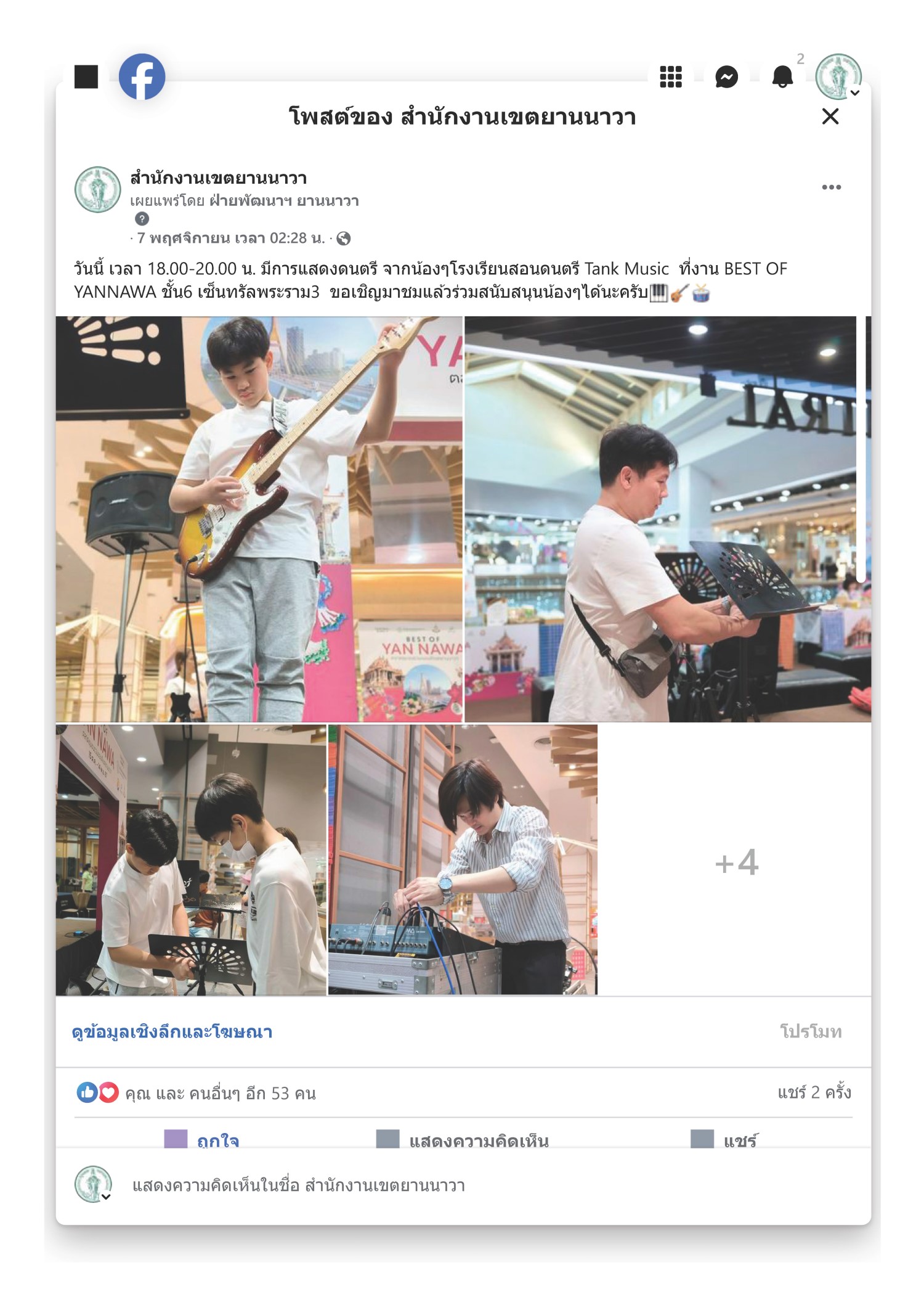 21-11-2024 1.00 สำนักงานเขตยานนาวา ดำเนินการผลิตสื่อประชาสัมพันธ์ ประเภท photo Album “การแสดงดนตรี Tank Music มจากงาน BEST OF YANNAWA” เผยแพร่ผ่านแพลตฟอร์ม Facebook เมื่อวันที่ 7 พฤศจิกายน 2567
