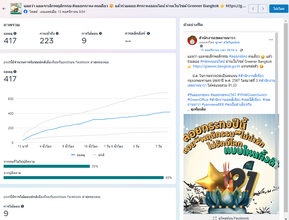 15-11-2024 1.00 สำนักงานเขตยานนาวา ดำเนินการผลิตสื่อประชาสัมพันธ์ ประเภท อินโฟกราฟิก “เชิญร่วมสืบสานประเพณีลอยกระทง ณ วัดทองบน ถนนพระราม3” เผยแพร่ผ่านแพลตฟอร์ม Facebook เมื่อวันที่ 13 พฤศจิกายน 2567