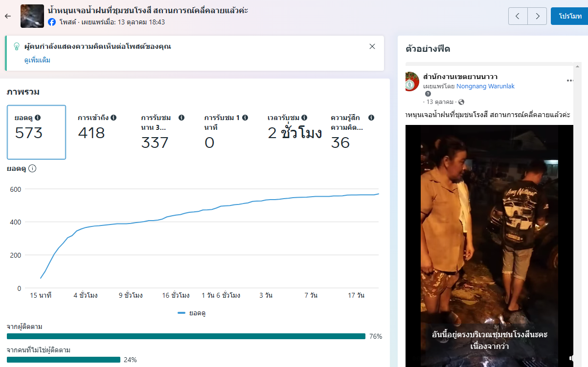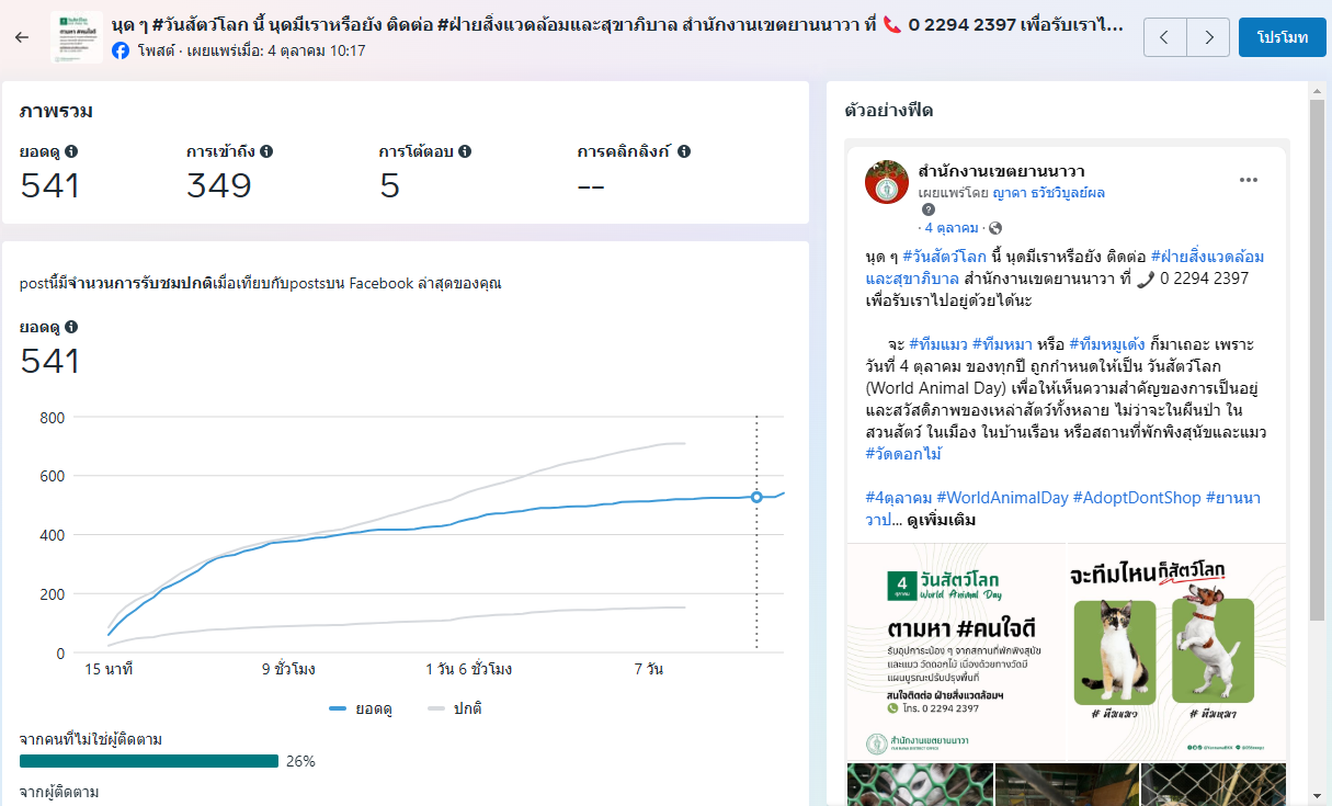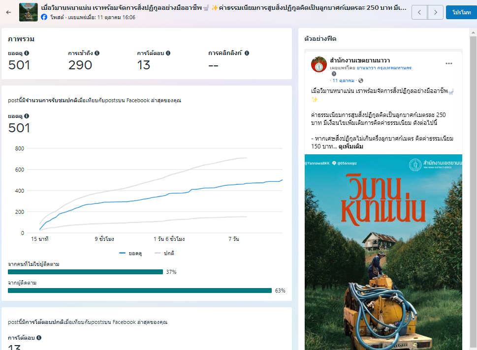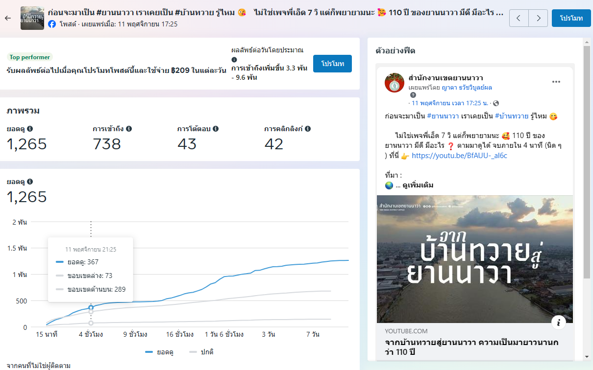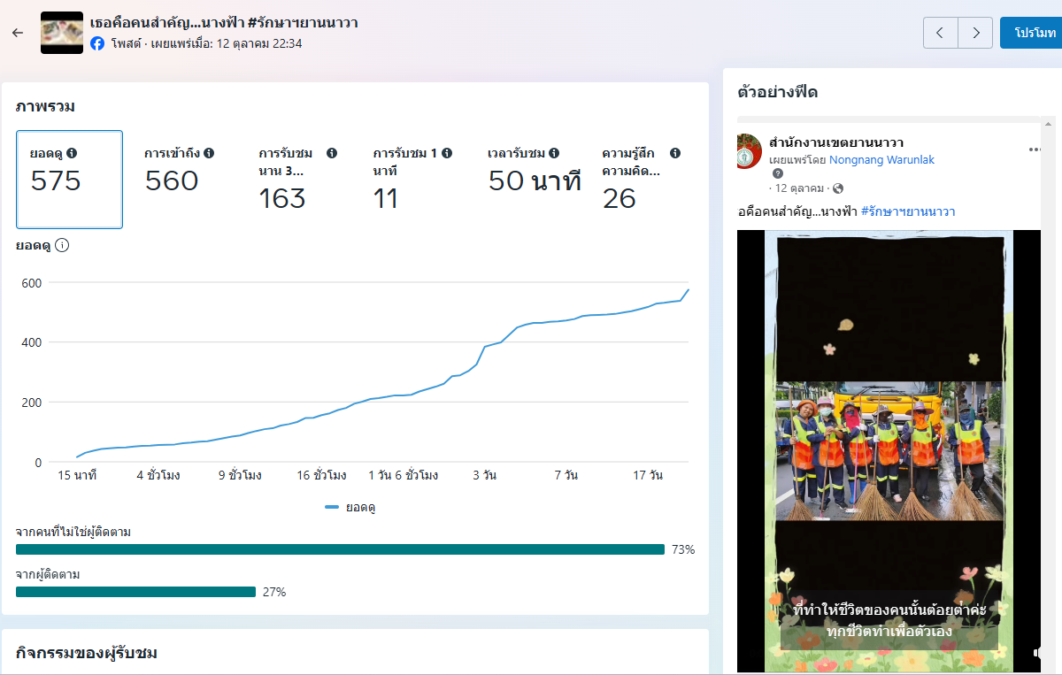 ![]() | 26-11-2024 | 1,104.00 | จำนวนการมีส่วนร่วมกับสื่อประชาสัมพันธ์ที่เผยแพร่ (Engagement) ผ่านช่องทาง Facebook สำนักงานเขตยานนาวา เมื่อวันที่ 26 ตุลาคม 2567 = 1,104 | ||
