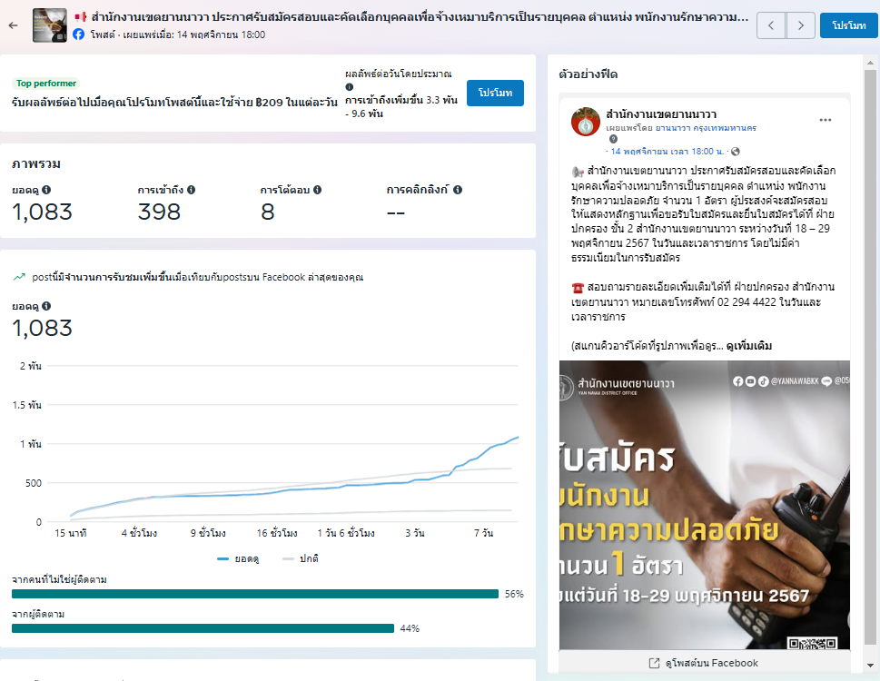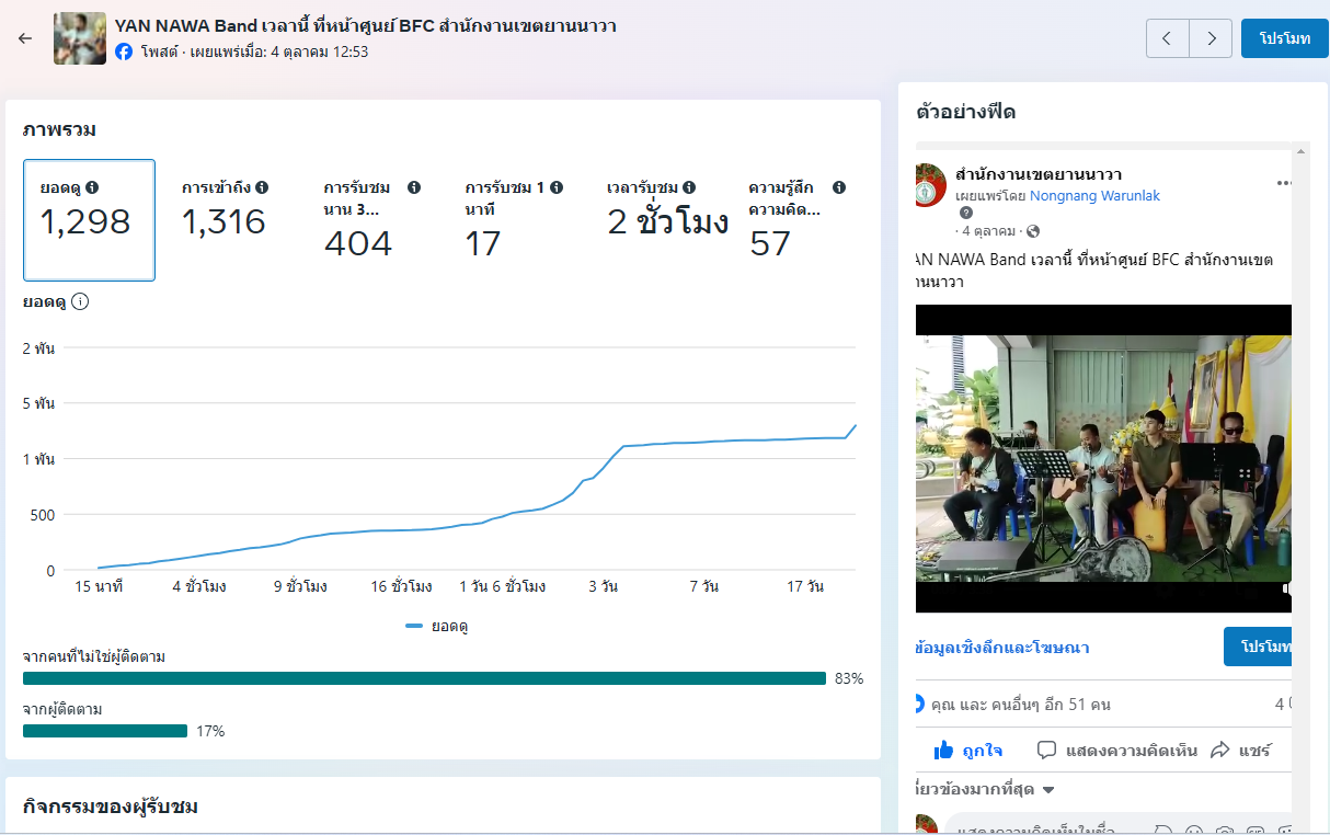 ![]() | 26-11-2024 | 4,992.00 | จำนวนการมีส่วนร่วมกับสื่อประชาสัมพันธ์ที่เผยแพร่ (Engagement) ผ่านช่องทาง Facebook สำนักงานเขตยานนาวา เมื่อวันที่ 24 ตุลาคม 2567 = 4,992 | ||