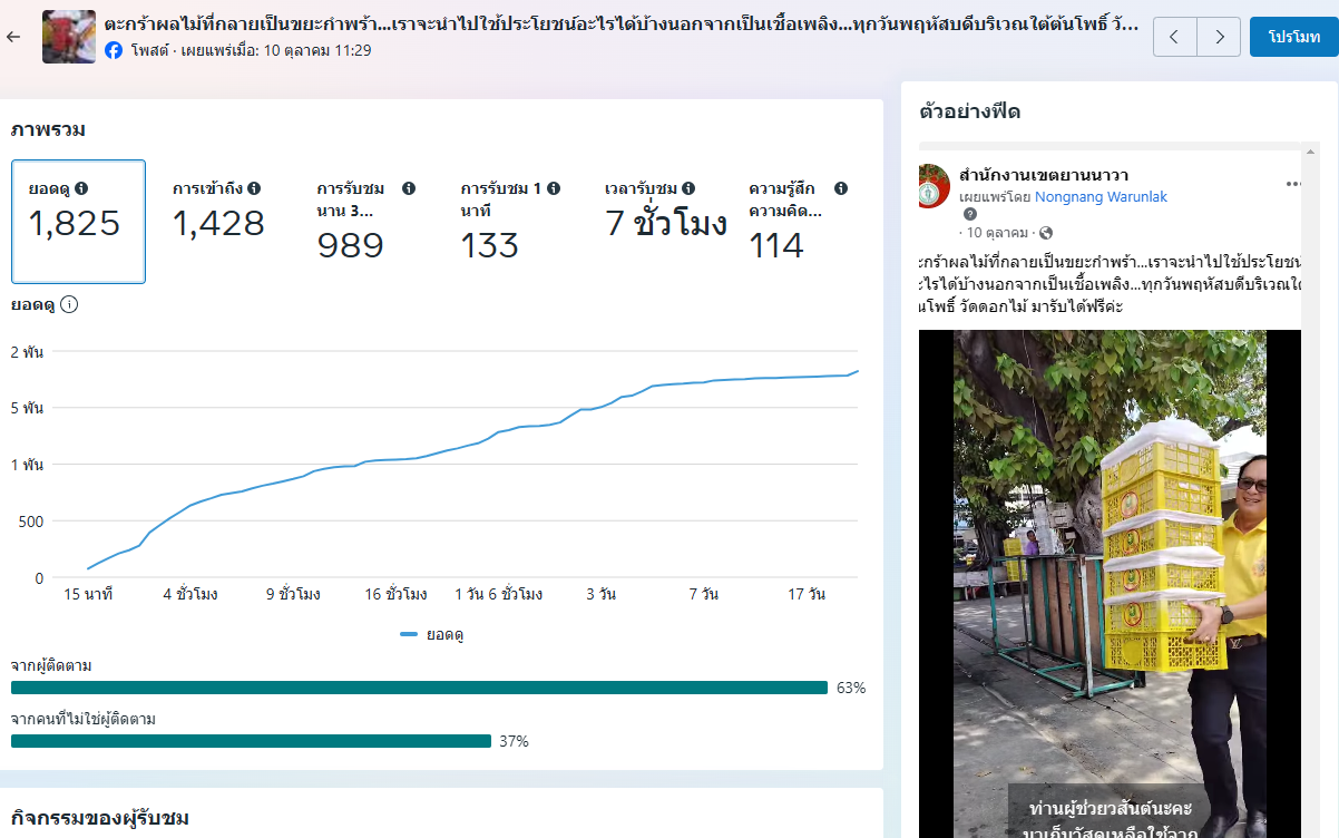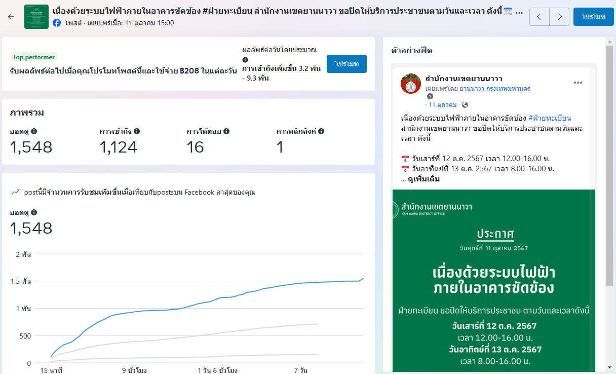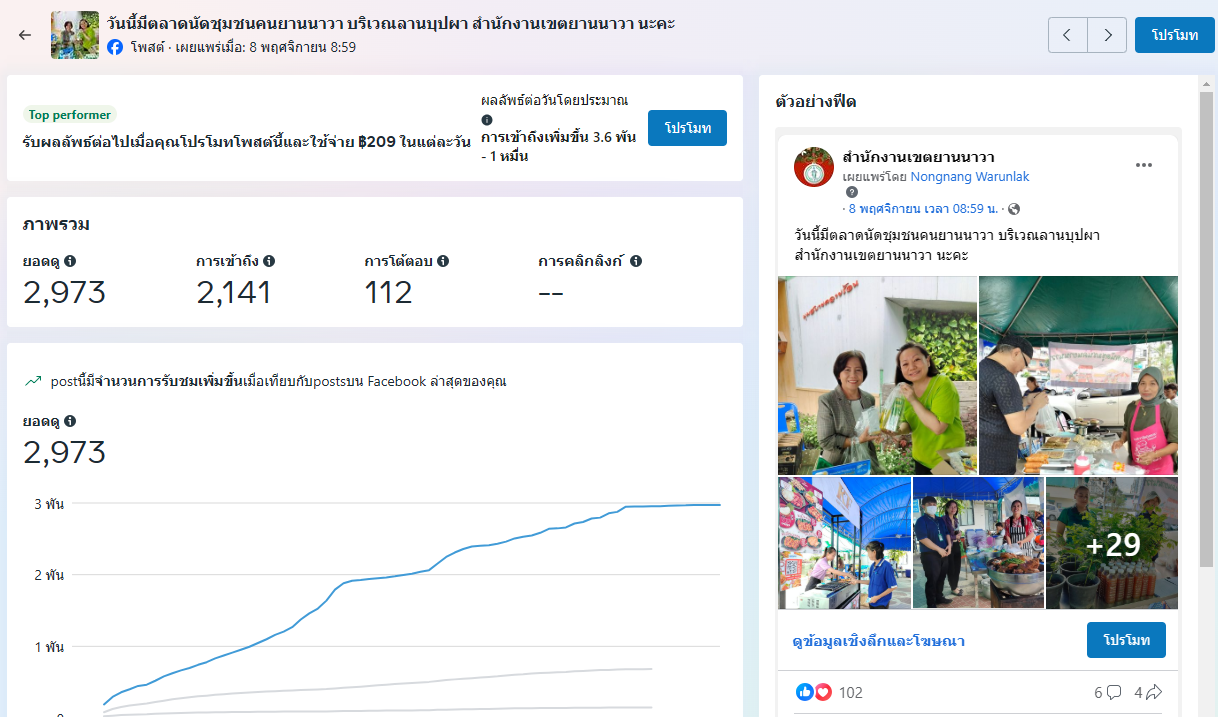 ![]() | 26-11-2024 | 1,564.00 | จำนวนการมีส่วนร่วมกับสื่อประชาสัมพันธ์ที่เผยแพร่ (Engagement) ผ่านช่องทาง Facebook สำนักงานเขตยานนาวา เมื่อวันที่ 11 ตุลาคม 2567 = 1,564 | ||