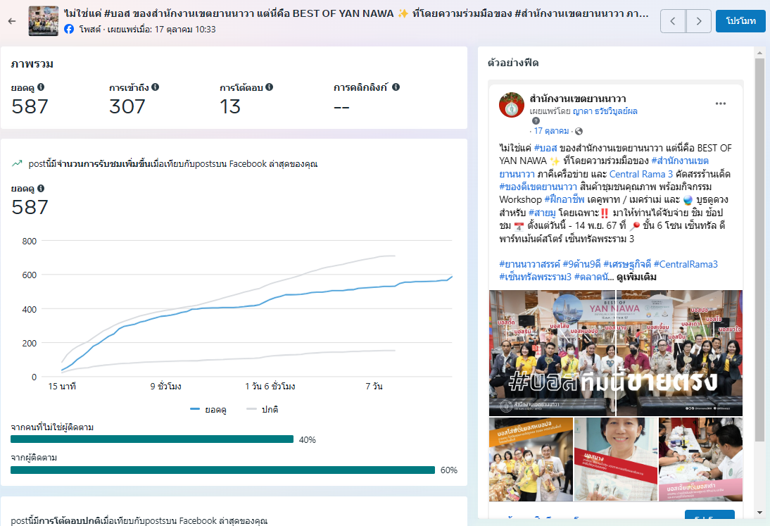 ![]() | 26-11-2024 | 1,308.00 | จำนวนการมีส่วนร่วมกับสื่อประชาสัมพันธ์ที่เผยแพร่ (Engagement) ผ่านช่องทาง Facebook สำนักงานเขตยานนาวา เมื่อวันที่ 11 พฤศจิกายน 2567 = 1,308 | ||