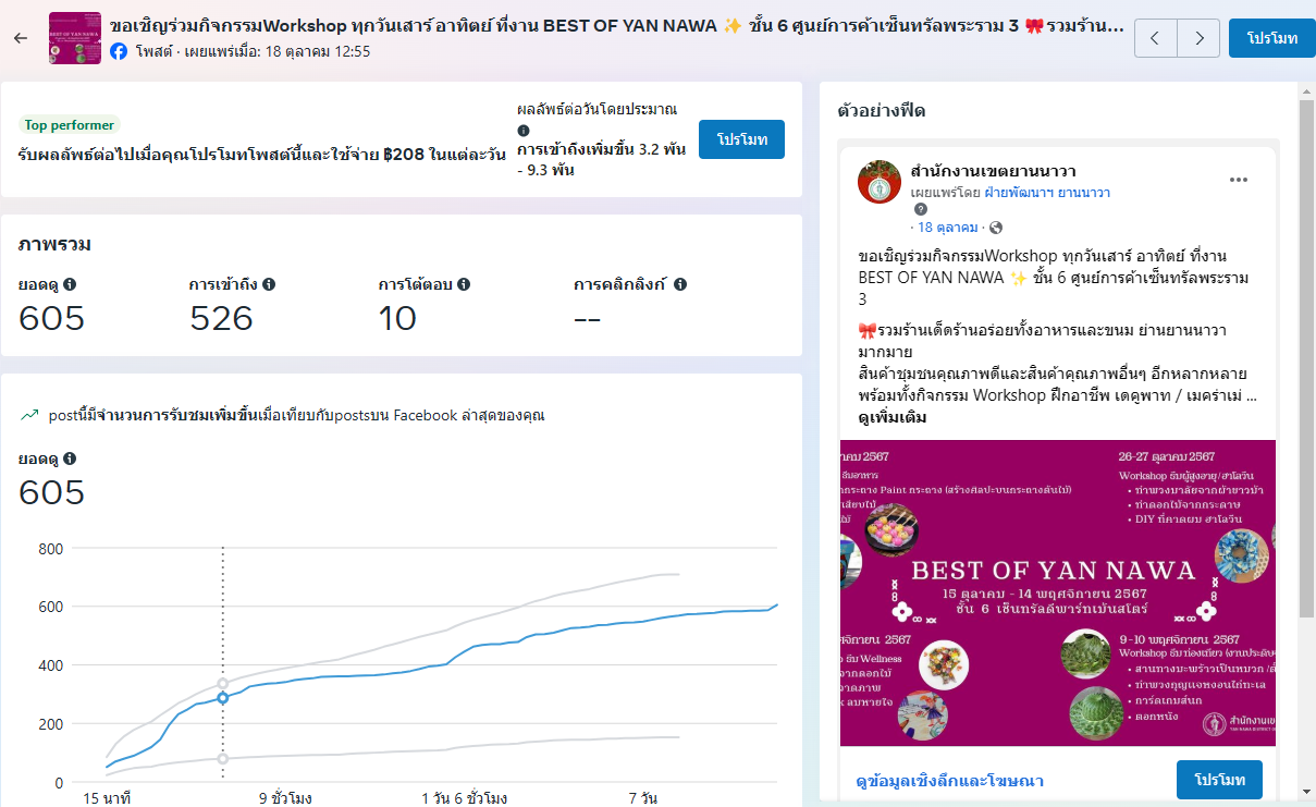 ![]() | 26-11-2024 | 600.00 | จำนวนการมีส่วนร่วมกับสื่อประชาสัมพันธ์ที่เผยแพร่ (Engagement) ผ่านช่องทาง Facebook สำนักงานเขตยานนาวา เมื่อวันที่ 17 ตุลาคม 2567 = 600 | ||