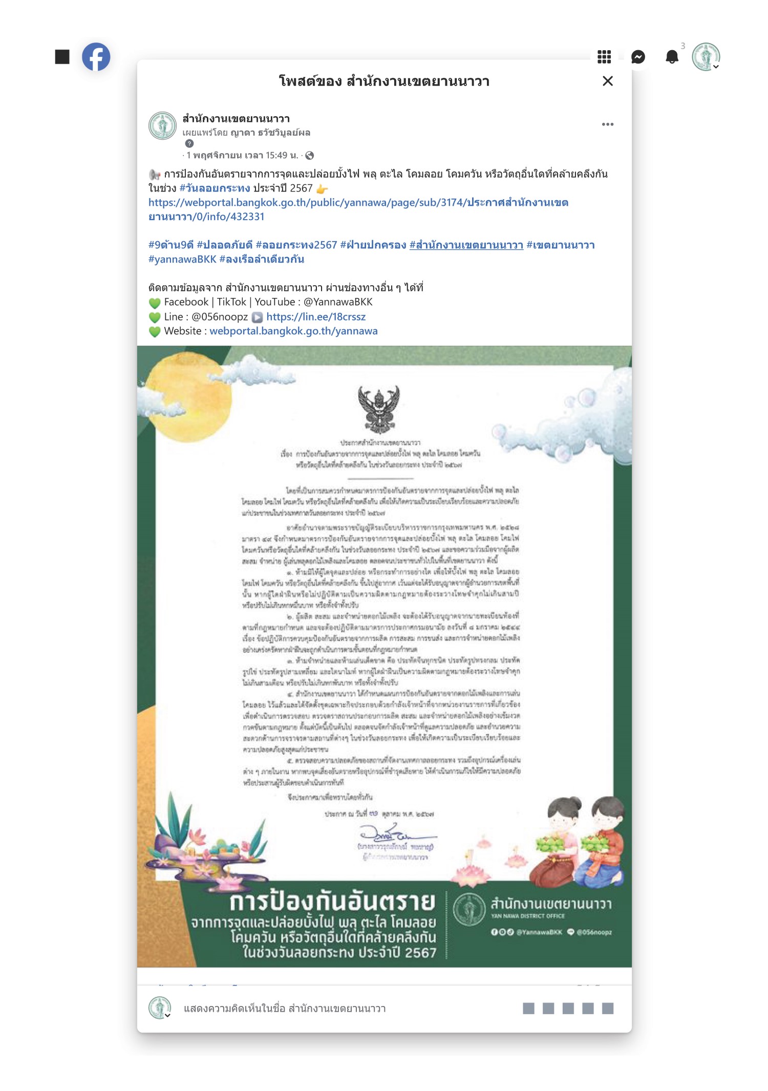 15-11-2024 1.00 สำนักงานเขตยานนาวา ดำเนินการผลิตสื่อประชาสัมพันธ์ ประเภท อินโฟกราฟิก “การป้องกันอันตรายจากการจุดและปล่อยบั้งไฟ พลุ ตะไล โคมลอย โคมควัน หรือวัตถุอื่นใดที่คล้ายคลึงกัน ในช่วงวันลอยกระทง ประจำปี 2567” เผยแพร่ผ่านแพลตฟอร์ม Facebook เมื่อวันที่ 1 พฤศจิกายน 2567