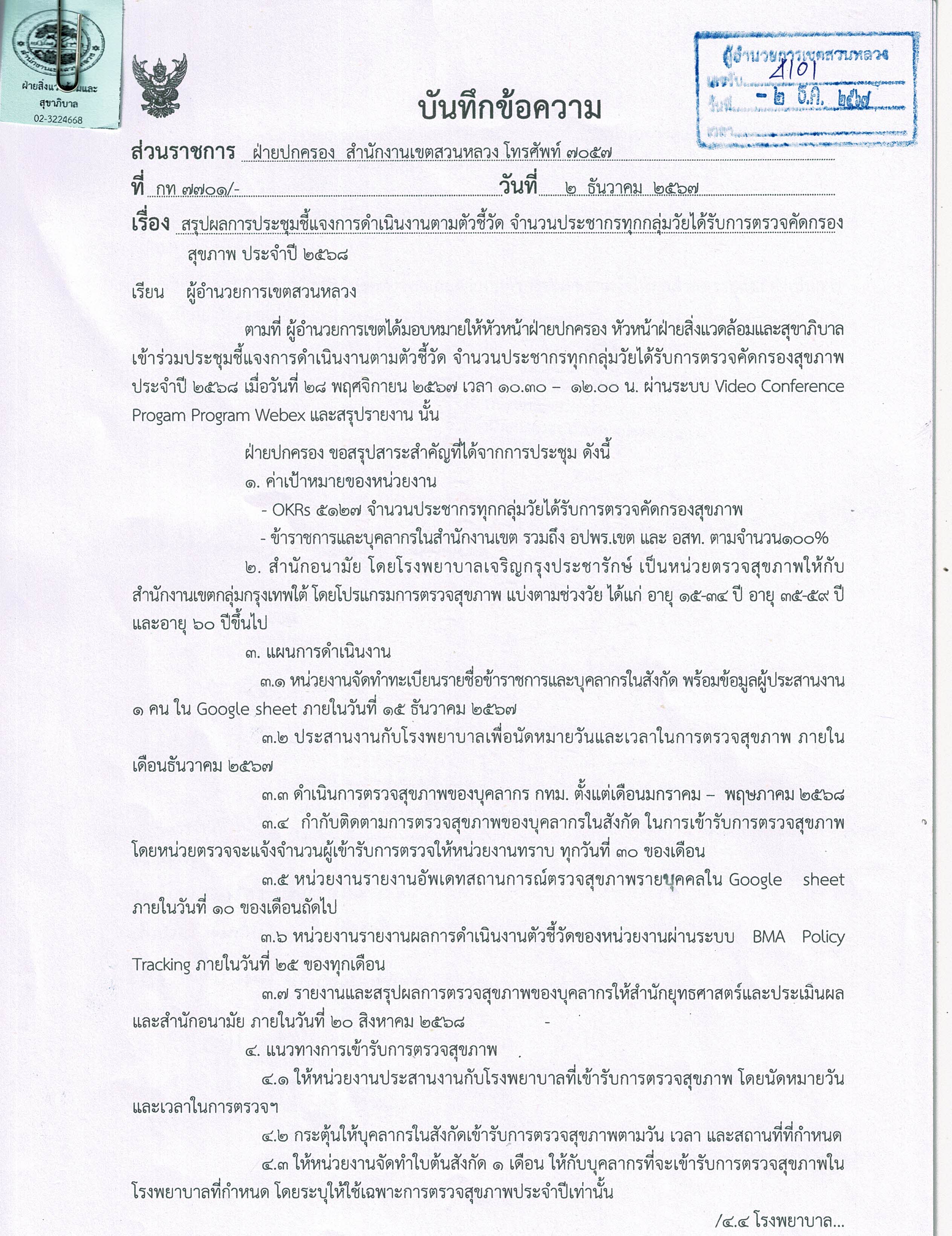 1 | ประชุมชี้แจงการดำเนินงาน นโยบายตรวจสุขภาพข้าราชการและบุคลากร กทม. | 10.00 | 01-11-2024 | 30-11-2024 |