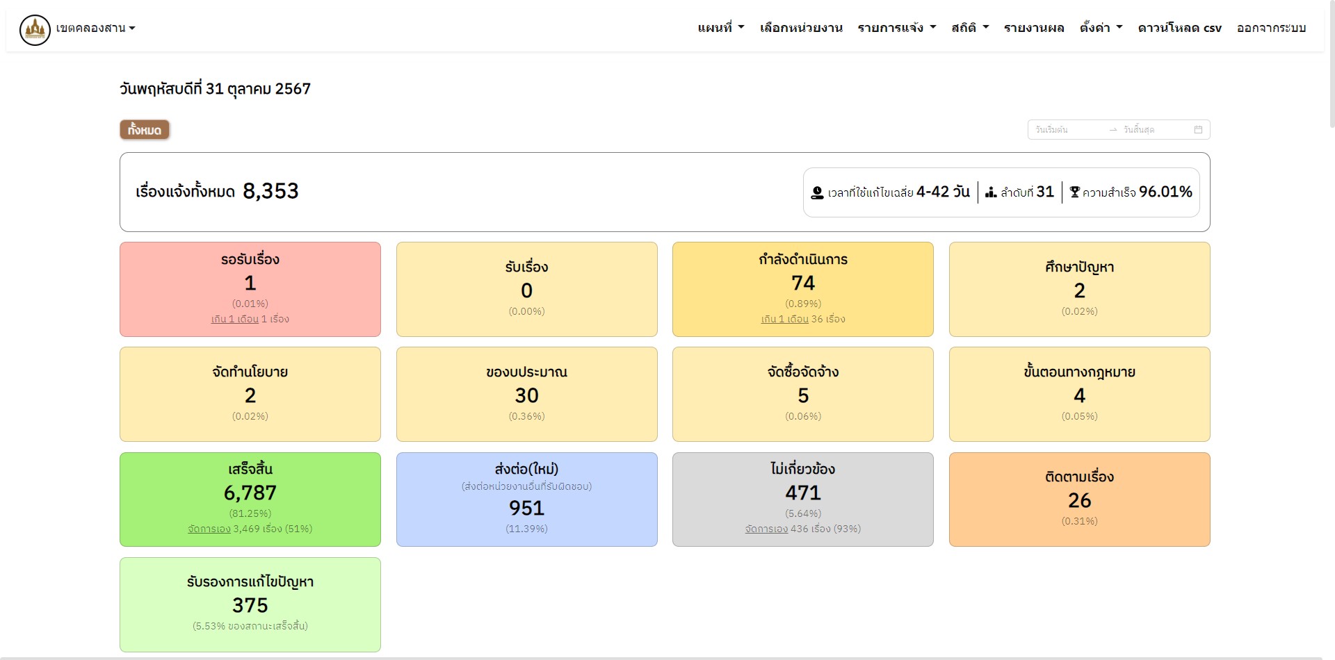 | 1 | รายงานผลการดำเนินงานการแก้ปัญหาข้อร้องเรียนผ่านระบบ Traffy Foundue ประจำเดือน ตุลาคม 2567 | 10.00 | 01-10-2024 | 31-10-2024 |
