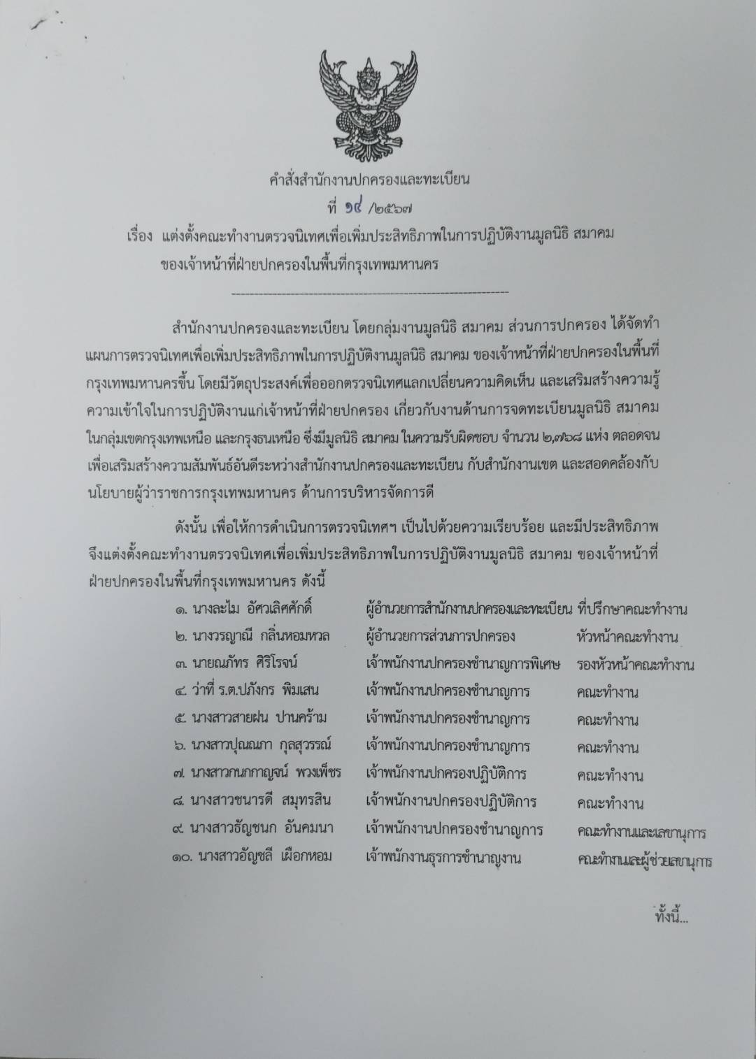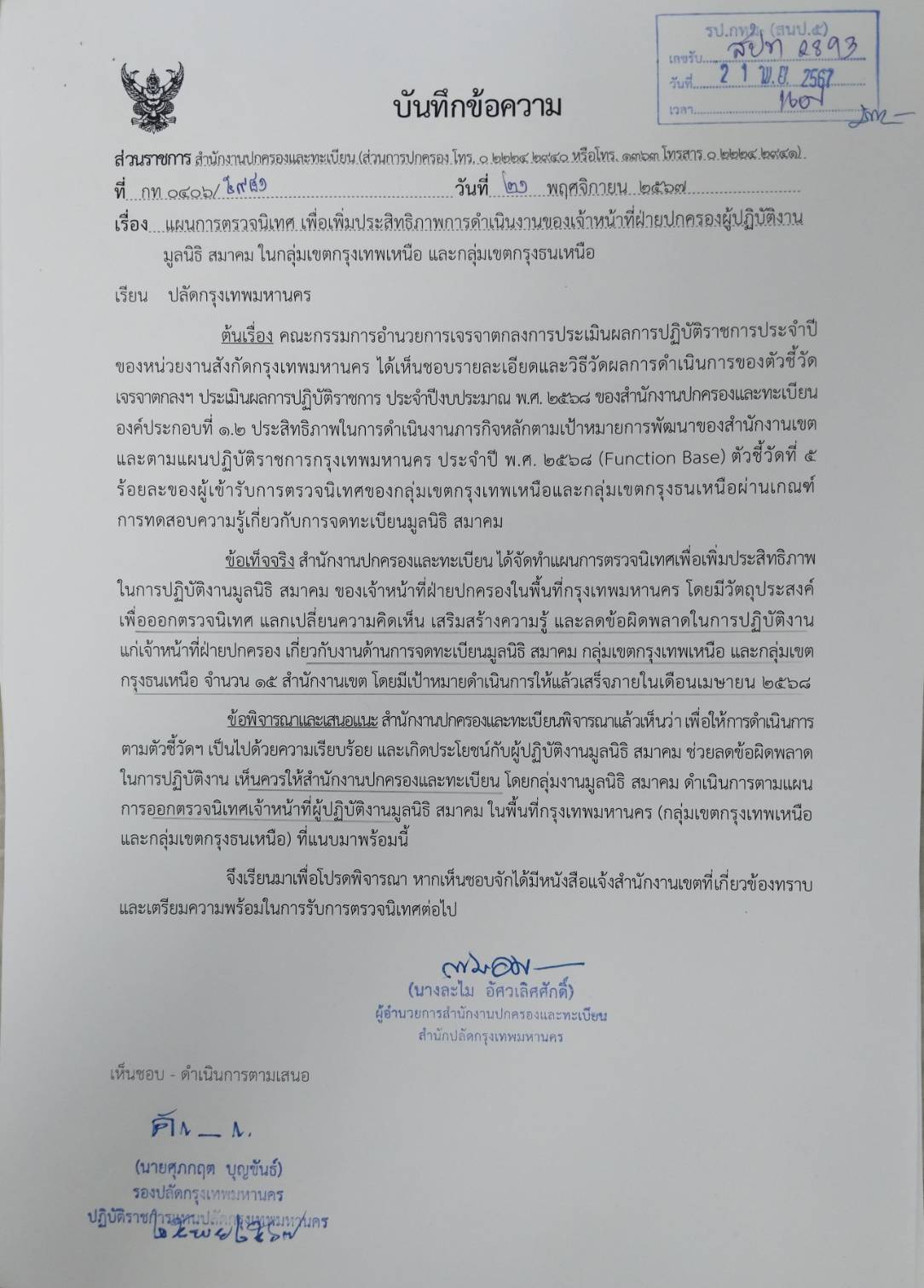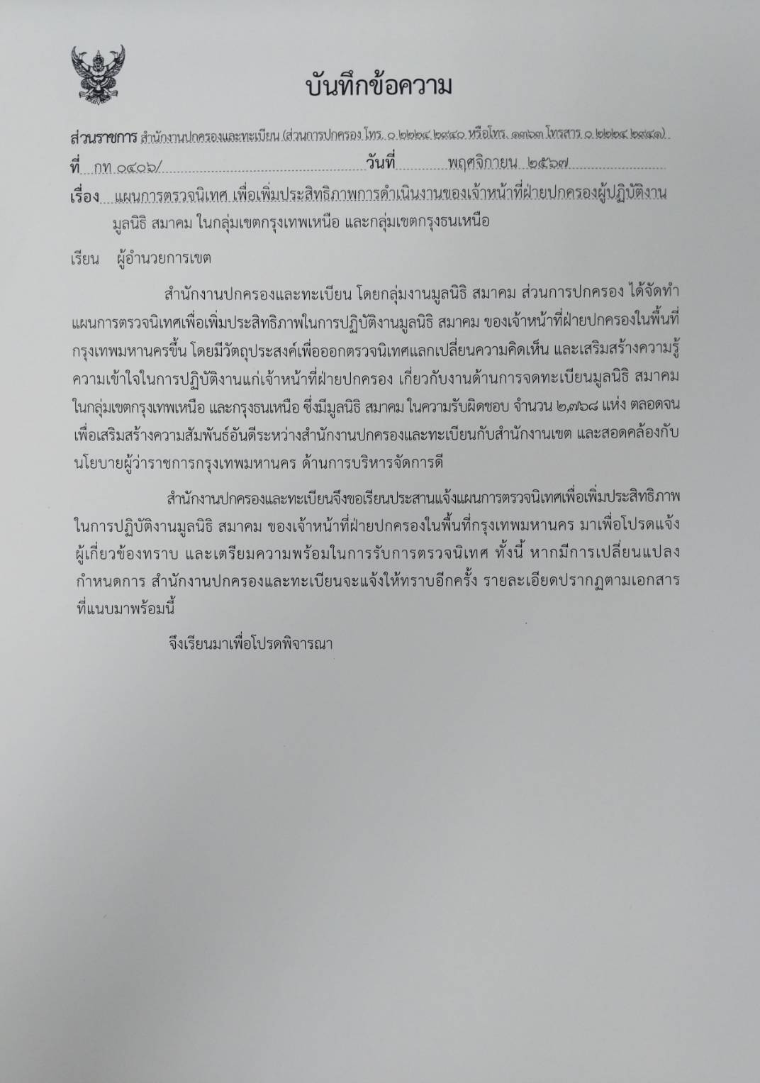 1 | จัดทำแต่งตั้งคณะทำงานตรวจนิเทศเพื่อเพิ่มประสิทธิภาพในการปฏิบัติงานมูลนิธิ สมาคมของเจ้าหน้าที่ฝ่ายปกครองในพื้นที่กรุงเทพมหานคร | 15.00 | 01-11-2024 | 30-11-2024 |