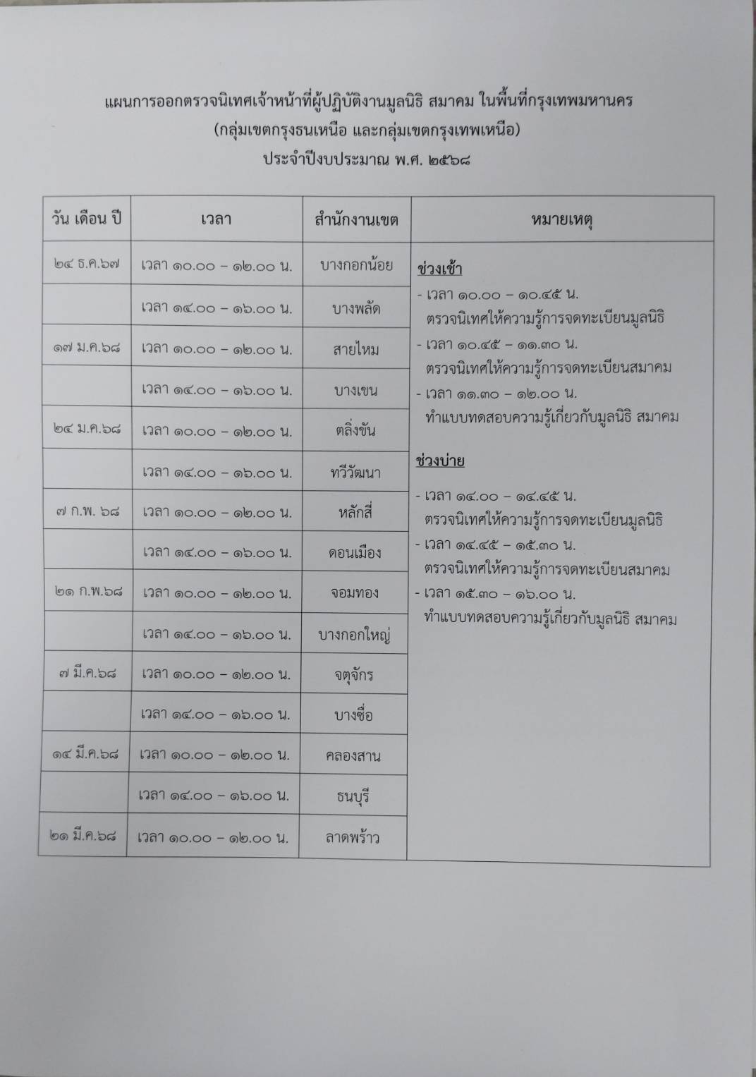 2 | กำหนดแผนการออกตรวจนิเทศ เจ้าหน้าที่ผู้ปฏิบัติงานมูลนิธิ สมาคม กลุ่มเขตกรุงเทพเหนือ และกรุงธนเหนือ | 15.00 | 01-11-2024 | 30-11-2024 |