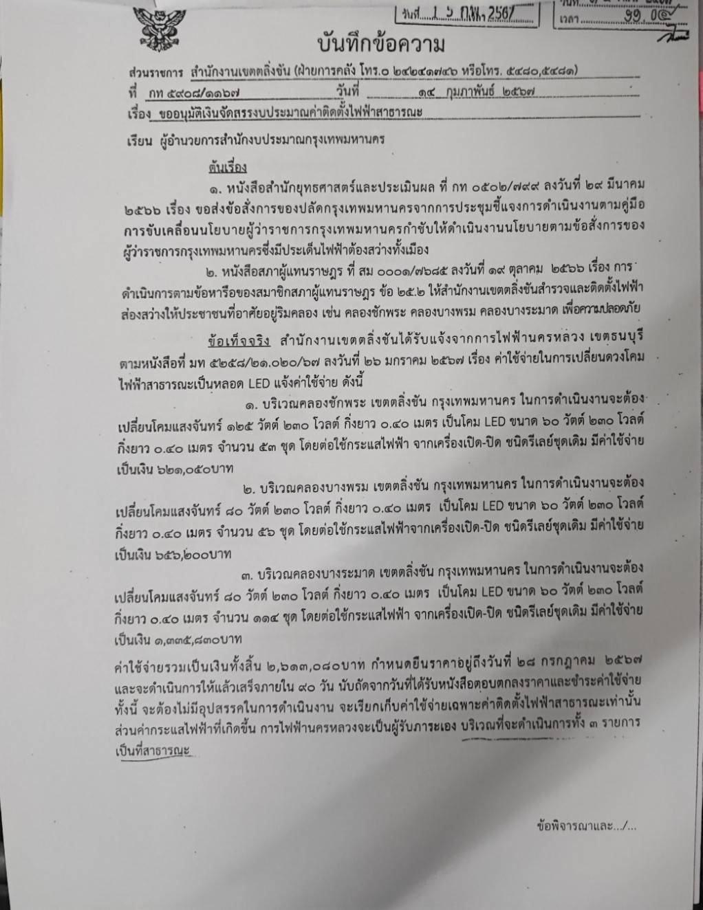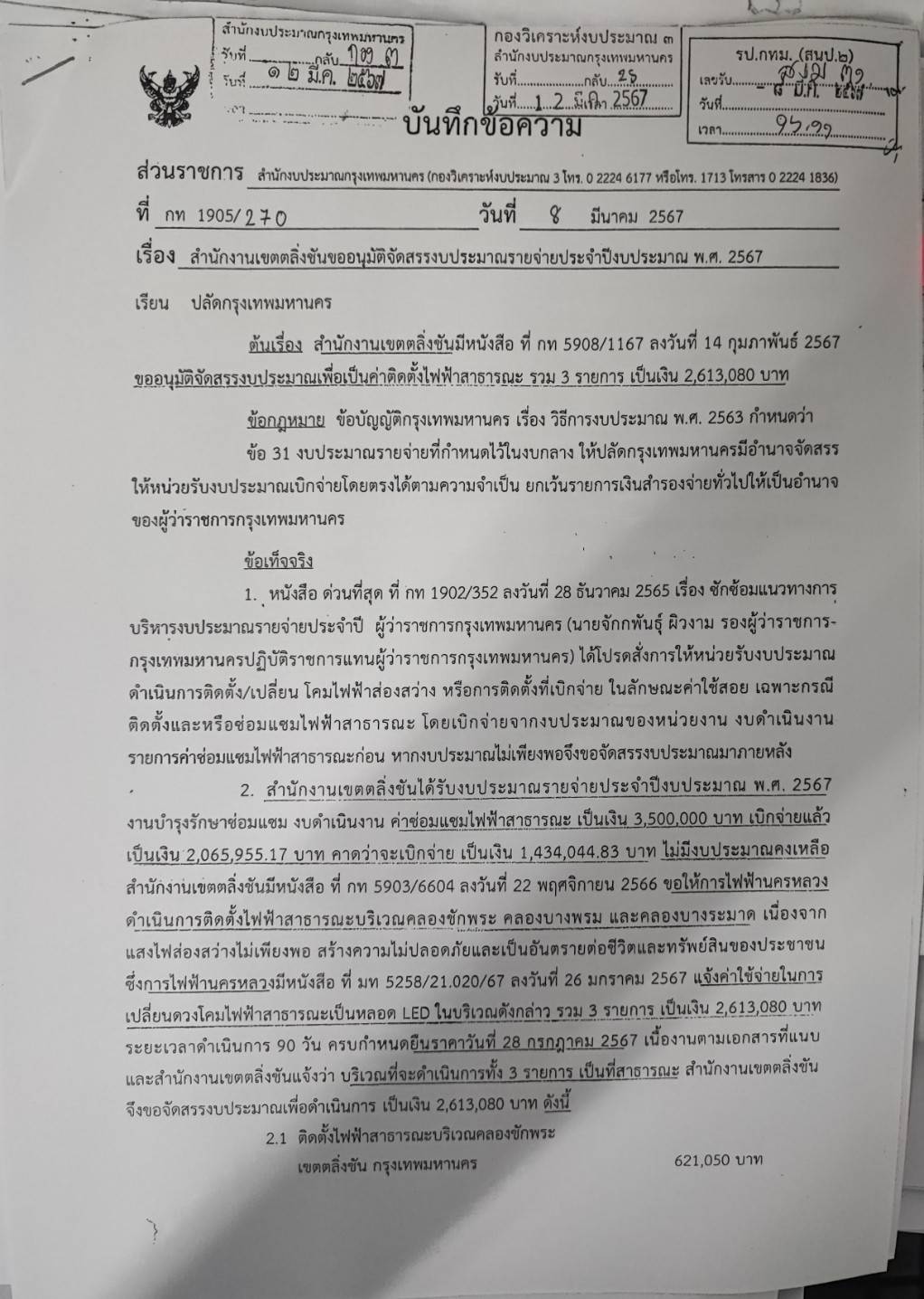 2 | ขออนุมัติเงินจัดสรรงบกลางประจำปีงบประมาณ 2567 ขอจัดสรรโครงการทางเดินชุมชนเลียบคลองสว่างปลอดภัยด้วยแสงไฟฟ้าโซล่าเซลล์ | 5.00 | 01-01-2424 | 30-09-2424 |