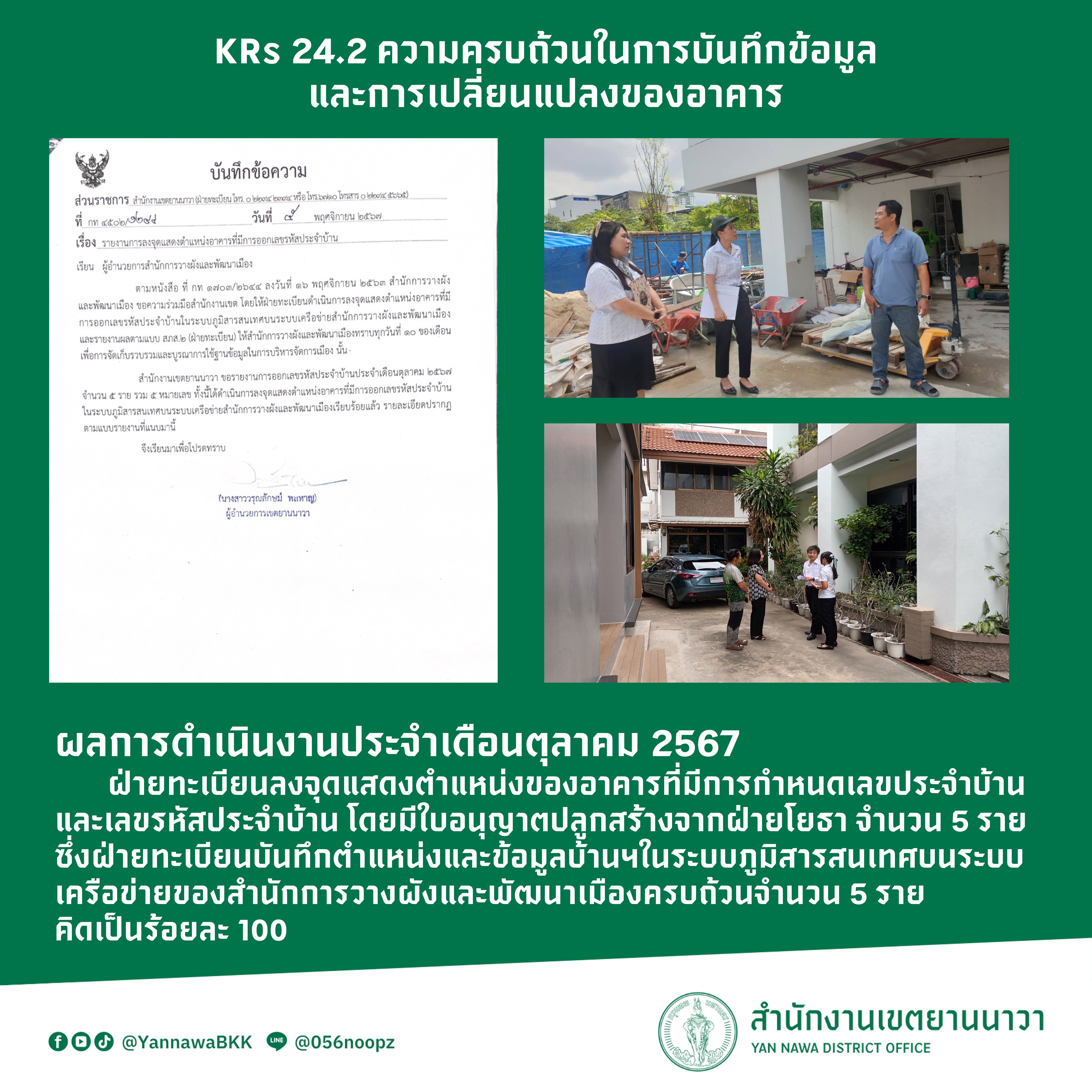 ![]() | 25-08-2025 | 100.00 | ผลการดำเนินการเฉลี่ยระหว่างฝ่ายโยธา และฝ่ายทะเบียนของสำนักงานเขตยานนาวา มีรายละเอียด ดังนี้ 1. จำนวนข้อมูลสะสมการให้อนุญาตปลูกสร้างอาคารในระบบ BMA OSS ตั้งแต่เดือนมกราคม จนถึงเดือนสิงหาคม จำนวน 39 คำขอ และจำนวนข้อมูลสะสมการให้อนุญาตปลูกสร้างอาคารจากระบบ BMA OSS ตั้งแต่เดือนมกราคม จนถึงเดือนสิงหาคม จำนวน 39 คำขอ คิดเป็นร้อยละ 100 2. จำนวนข้อมูลสะสมการออกเลขที่บ้านและเลขรหัสประจำบ้านในระบบของ สวพ. ตั้งแต่เดือนมกราคม จนถึงเดือนสิงหาคม จำนวน 83 รายการบ้าน และมีจำนวนรายการบ้านสะสมจากระบบทะเบียนราษฎร (สทร.) ตั้งแต่เดือนมกราคม จนถึงเดือนสิงหาคม จำนวน 83 รายการบ้าน คิดเป็นร้อยละ 100 | ||