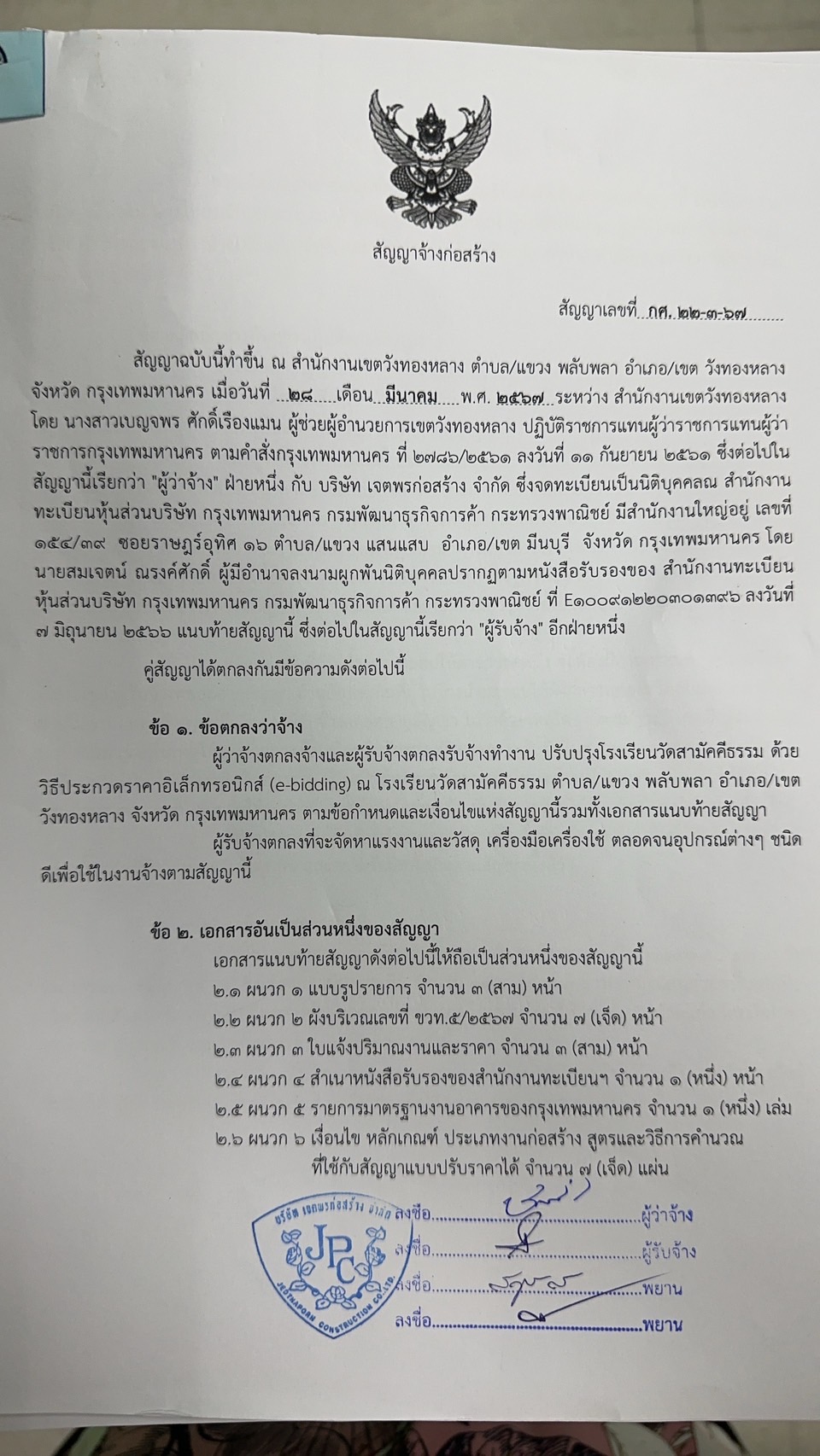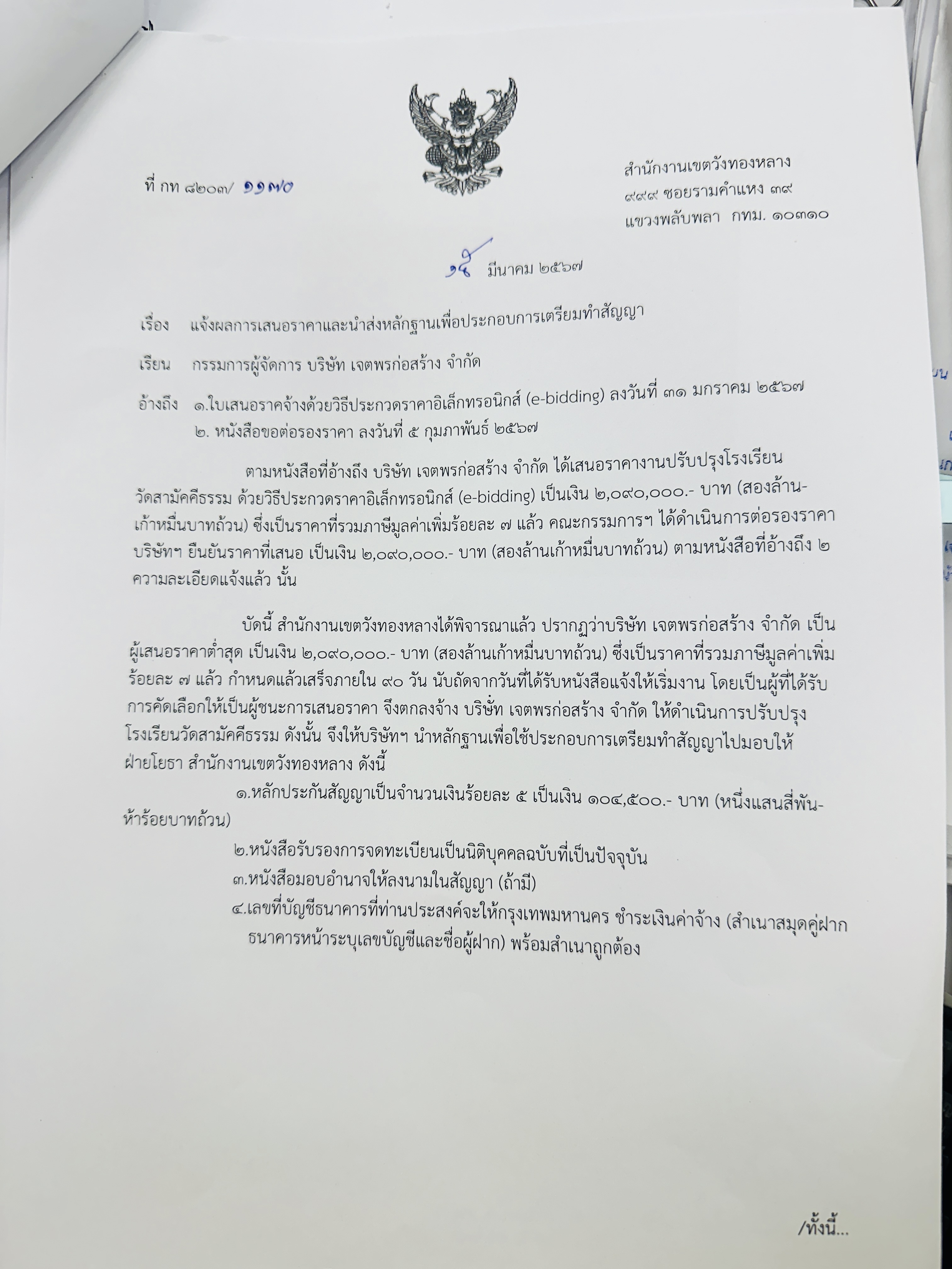 26-03-20240.00แจ้งให้ผู้รับรับจ้าง บริษัท เจตพรก่อสร้าง ให้มาวางค้ำประกันสัญญา