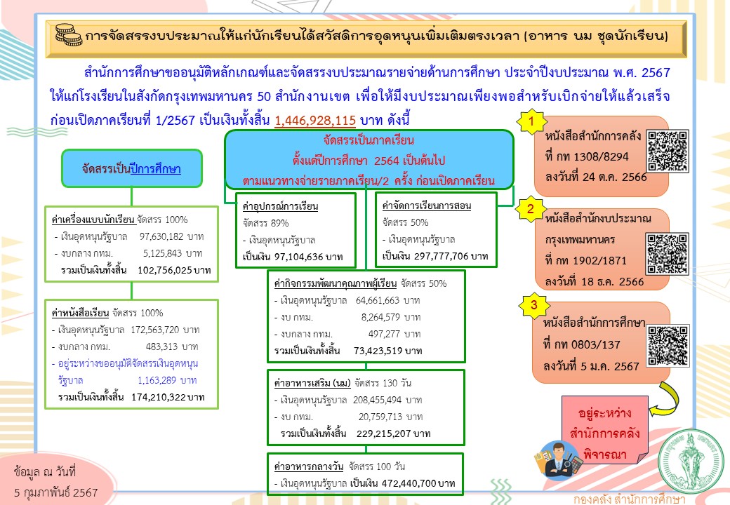 | 06-02-2024 | 0.00 |  | สำนักการศึกษาจัดสรรงบประมาณด้านการศึกษาให้แก่โรงเรียนในสังกัดกรุงเทพมหานคร เพื่อให้มีงบประมาณเพียงพอสำหรับเบิกจ่ายให้แล้วเสร็จก่อนเปิดภาคเรียนที่ 1/2567 เรียบร้อยแล้ว 6 รายการ และอยู่ระหว่างขออนุมัติจัดสรรค่าหนังสือเรียน ให้แก่ 44 สำนักงานเขต เพิ่มเติม | |