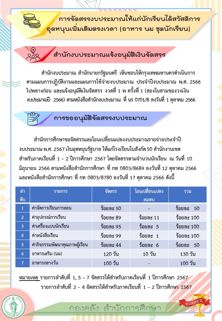 1. จัดสรรงบประมาณตามสถิติจำนวนนักเรียน ณ วันที่ 10 มิถุนายน 2566 จำนวน 253,554 คน เป็นเงิน 1,446,928,115.- บาท