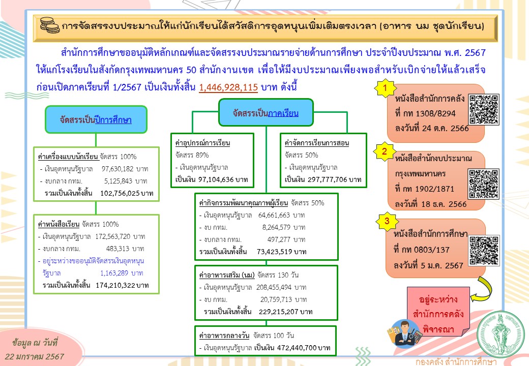| 22-01-2024 | 0.00 |  | สำนักการศึกษาจัดสรรงบประมาณด้านการศึกษาให้แก่โรงเรียนในสังกัดกรุงเทพมหานคร เพื่อให้มีงบประมาณเพียงพอสำหรับเบิกจ่ายให้แล้วเสร็จก่อนเปิดภาคเรียนที่ 1/2567 เรียบร้อยแล้ว 6 รายการ และอยู่ระหว่างขออนุมัติจัดสรรค่าหนังสือเรียน ให้แก่ 44 สำนักงานเขต เพิ่มเติม | |