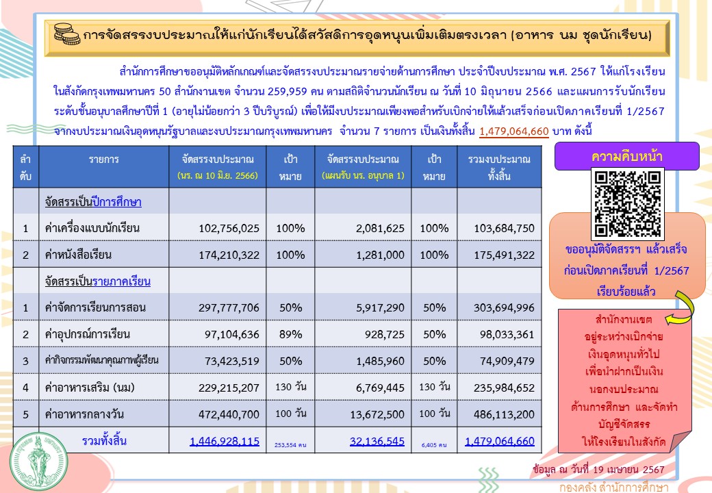 | 19-04-2024 | 0.00 |  | สำนักการศึกษาขออนุมัติจัดสรรงบประมาณรายจ่ายด้านการศึกษา ประจำปีการศึกษา 2567 ให้แก่นักเรียนในโรงเรียนสังกัดกรุงเทพมหานคร จำนวน 437 โรงเรียน จากงบประมาณเงินอุดหนุนรัฐบาลและงบประมาณกรุงเทพมหานคร เพื่อให้มีงบประมาณเพียงพอสำหรับเบิกจ่ายเงินให้แล้วเสร็จก่อนเปิดภาคเรียน ที่ 1 ปีการศึกษา 2567 จำนวน 7 รายการ รวมเป็นเงินทั้งสิ้น 1,479,064,660.- บาท ขณะนี้อยู่ระหว่างสำนักงานเขตดำเนินการเบิกจ่ายเงินอุดหนุนทั่วไปเพื่อนำฝากเป็นเงินนอกงบประมาณด้านการศึกษาของสำนักงานเขต และจัดทำบัญชีจัดสรรให้โรงเรียนในสังกัด | |