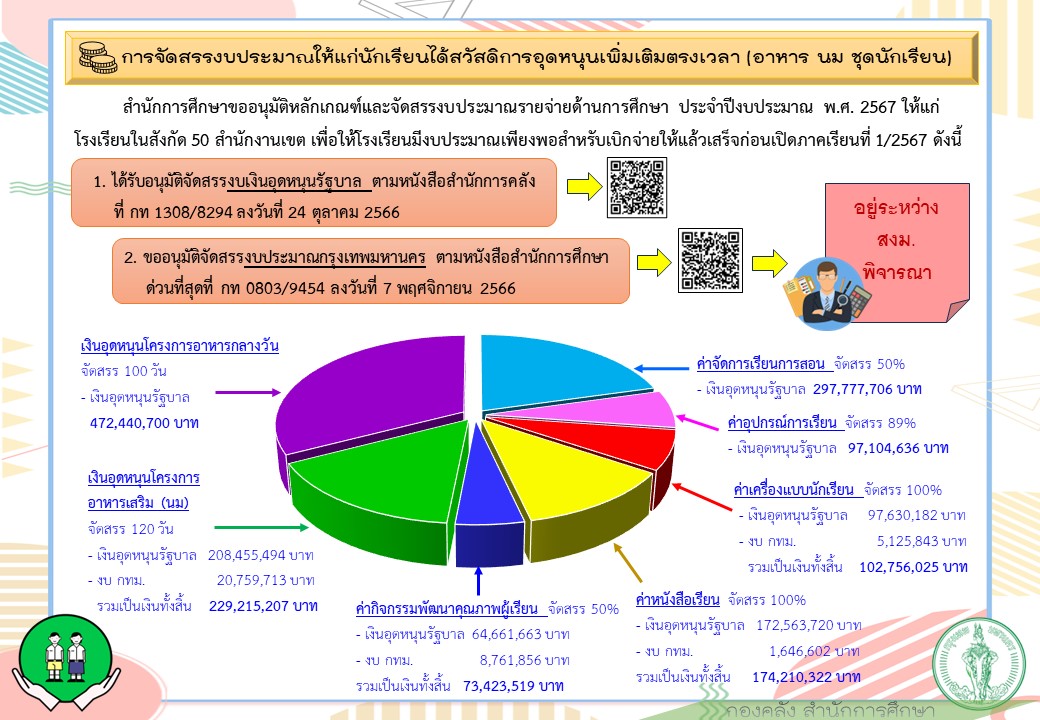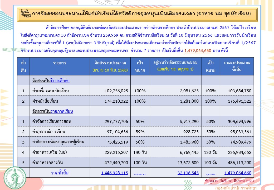 | 18-03-2024 | 0.00 |  | สำนักการศึกษาจัดสรรงบประมาณรายจ่ายด้านการศึกษา ประจำปีการศึกษา 2567 ให้แก่นักเรียนในโรงเรียนสังกัดกรุงเทพมหานคร จำนวน 437 โรงเรียน จากงบประมาณเงินอุดหนุนรัฐบาลและงบประมาณกรุงเทพมหานคร เพื่อให้มีงบประมาณเพียงพอสำหรับเบิกจ่ายเงินให้แล้วเสร็จก่อนเปิดภาคเรียน ที่ 1 ปีการศึกษา 2567 จำนวน 7 รายการ รวมเป็นเงินทั้งสิ้น 1,479,064,660.- บาท ดังนี้