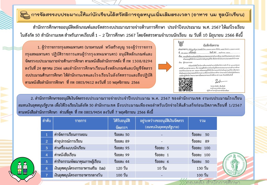 | 21-11-2023 | 0.00 |  | สำนัการศึกษาจัดสรรงบประมาณด้านการศึกษาให้แก่นักเรียนในโรงเรียนสังกัดกรุงเทพมหานคร 50 สำนักงานเขต สำหรับภาคเรียนที่ 1 -2 ปีการศึกษา 2567 และมีหนังสือแจ้งสำนักงานเขตเรียบร้อยแล้ว ตามหนังสือสำนักการศึกษา ที่ กท 0803/9612 ลงวันที่ 10 พ.ย. 2566 | |