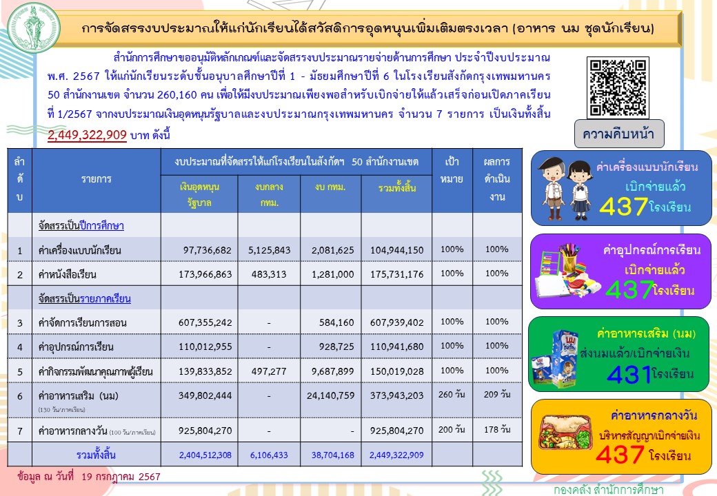 | 19-07-2024 | 0.00 |  | สำนักการศึกษาขออนุมัติหลักเกณฑ์และจัดสรรงบประมาณเงินอุดหนุนรัฐบาล และงบประมาณกรุงเทพมหานคร เพื่อจัดสรรงบประมาณด้านการศึกษา ให้แก่โรงเรียนในสังกัดกรุงเทพมหานคร 50 สำนักงานเขต โดยจัดสรรตามสถิติจำนวนนักเรียน ณ วันที่ 10 มิถุนายน 2566 และแผนการรับนักเรียนระดับชั้นอนุบาลศึกษาปีที่ 1 (อายุไม่น้อยกว่า 3 ปีบริบูรณ์) จำนวนทั้งสิ้น 260,160 คน เพื่อให้มีงบประมาณเพียงพอสำหรับเบิกจ่ายให้แล้วเสร็จก่อนเปิดภาคเรียนที่ 1/2567 จำนวน 7 รายการ เป็นเงินทั้งสิ้น 2,449,322,909 บาท ดังนี้ 1. ค่าจัดการเรียนการสอน 607,939,402 บาท 2. ค่าอุปกรณ์การเรียน 110,941,680 บาท 3. ค่าเครื่องแบบนักเรียน 104,944,150 บาท 4. ค่าหนังสือเรียน 175,731,176 บาท 5. ค่ากิจกรรมพัฒนาคุณภาพผู้เรียน 150,019,028 บาท 6. ค่าอาหารเสริม (นม) 209 วัน 373,943,203 บาท 7. ค่าอาหารกลางวัน 178 วัน 925,804,270 บาท ขณะนี้อยู่ระหว่างรวบรวมเอกสารขออนุมัติจัดสรรงบประมาณเพิ่มเติมให้แก่โรงเรียนที่มีจำนวนนักเรียนเพิ่มขึ้น จำนวน 21 สำนักงานเขต | |