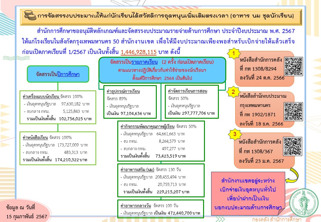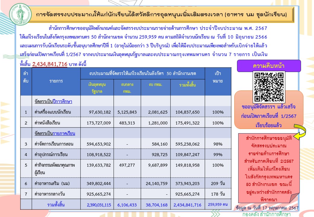 | 19-09-2024 | 0.00 |  | สำนักการศึกษาขออนุมัติหลักเกณฑ์และจัดสรรงบประมาณรายจ่ายด้านการศึกษา ให้แก่ 50 สำนักงานเขต เพื่อให้โรงเรียนในสังกัดกรุงเทพมหานคร 437 โรงเรียน มีงบประมาณเพียงพอสำหรับเบิกจ่ายก่อนเปิดภาคเรียนที่ 1 ปีการศึกษา 2567 จากงบประมาณเงินอุดหนุนรัฐบาลและงบประมาณกรุงเทพมหานคร จำนวน 7 รายการ เรียบร้อยแล้ว เป็นเงินทั้งสิ้น 2,460,886,534 บาท ดังนี้ 1. ค่าจัดการเรียนการสอน 611,850,664 บาท 2. ค่าอุปกรณ์การเรียน 111,664,850 บาท 3. ค่าเครื่องแบบนักเรียน 105,607,875 บาท 4. ค่าหนังสือเรียน 176,883,284 บาท 5. ค่ากิจกรรมพัฒนาคุณภาพผู้เรียน 151,056,574 บาท 6. ค่าอาหารเสริม (นม) 374,417,457 บาท และ 7. ค่าอาหารกลางวัน 929,405,830 บาท | |