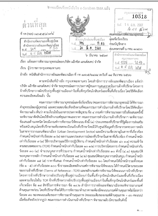 ![]() | 25-04-2024 | 0.00 | - กรมบัญชีกลาง มีหนังสือด่วนที่สุด ที่ กค (กอร) 0405.5/8194 ลงวันที่ 6 มีนาคม 2567 แจ้งผลการพิจารณาอุทธรณ์ของบริษัท แอ๊กซิส แลนด์สเคป จำกัด โดยกรมบัญชีกลางมีข้อสรุปว่า ข้อกล่าวอ้างของผู้อุทธรณ์โดยบริษัท แอ๊กซิส แลนด์สเคป จำกัด ฟังขึ้น และมีผลต่อการจัดซื้อจัดจ้างและการบริหารพัสดุภาครัฐ พ.ศ. 2560 ข้อ 120 (8) ประกอบข้อ 114 (4) ซึ่งก่อให้เกิดการได้เปรียบเสียเปรียบระหว่างผู้ยื่นข้อเสนอด้วยกัน ดังนั้น ข้อกล่าวอ้างของผู้อุทธรณ์ฟังขึ้น จึงให้สำนักการวางผังและพัฒนาเมืองยกเลิกการดำเนินการการจัดซื้อจัดจ้างโครงการจ้างที่ปรึกษาฯ ในครั้งนี้ - คณะกรรมการดำเนินการจ้างที่ปรึกษา ฯ ประชุมหารือรับทราบผลการพิจารณาอุทธรณ์จากกรมบัญชีกลาง เมื่อวันจันทร์ที่ 25 มี.ค. 67 - สำนักงานพัฒนาและฟื้นฟูเมือง มีหนังสือขออนุมัติยกเลิกประกาศผู้ชนะและยกเลิกดำเนินการจ้าง ที่ปรึกษาฯ ที่ สอฟ.221/67 ลว. 4 เม.ย. 67 และหนังสือประกาศกรุงเทพมหานคร เรื่องยกเลิกประกาศ ผู้ชนะ และยกเลิกดำเนินงานจ้างฯ ลว. 17 เม.ย. 67 - สำนักงานพัฒนาและฟื้นฟูเมือง มีหนังสือ ที่ กท 1705/658 ลว. 18 เม.ย. 67 เรื่องขอแจ้งผลการยกเลิกโครงการจ้างที่ปรึกษาวางผังปรับปรุงฟื้นฟูย่านเมืองเก่าในพื้นที่กรุงรัตนโกสินทร์และพื้นที่เกี่ยวเนื่อง โดยวิธีคัดเลือก และหนังแจ้งสถึง กิจการร่วมค้า กรรมการผู้จัดการบริษัท พีเอสเค คอนซัลเทนส์ จำกัด และกรรมการผู้จัดการบริษัท ซิตี้ แพลน โปรเฟสชันนอล จำกัด และกรรมการผู้จัดการ บริษัท แอ๊กซิส แลนด์สเคป จำกัด(ผู้ยื่นอุทธรณ์) - สำนักงานพัฒนาและฟื้นฟูเมือง ลงรายละเอียดข้อมูลในระบบ E- Gp ของกรมบัญชีกลางโดยจัดทำประกาศจัดซื้อจัดจ้าง/ยกเลิกประกาศผู้ชนะและยกเลิกรายการโครงการฯ ย่านเมืองเก่ารัตนโกสินทร์ในระบบการจัดซื้อจัดจ้าง | ||