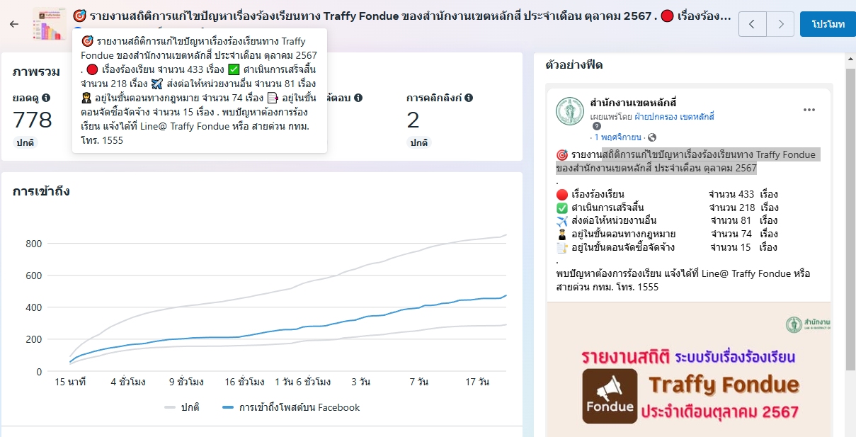 ![]() | 11-12-2024 | 784.00 | สำนักงานเขตหลักสี่ ดำเนินการผลิตสื่อประชาสัมพันธ์ “สถิติการแก้ไขปัญหาเรื่องร้องเรียนทาง Traffy Fondue ของสำนักงานเขตหลักสี่ ประจำเดือน ตุลาคม 2567 " เผยแพร่ผ่านแพลตฟอร์ม Facebook เมื่อวันที่ 1 พฤศจิกายน 2567 มียอดดู 778 ยอดการโต้ตอบ 6 รวม 784 | ||