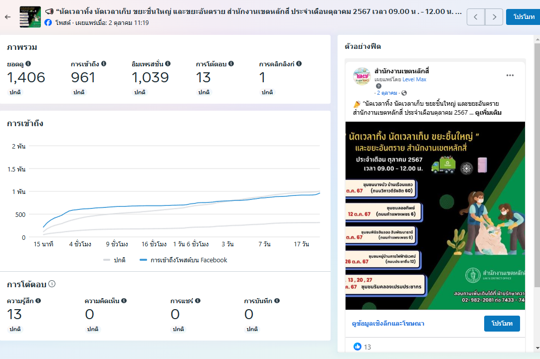 ![]() | 26-11-2024 | 1,419.00 | จำนวนการเข้าถึงสื่อประชาสัมพันธ์ที่เผยแพร่ (Engagement) ผ่านช่องทาง Facebook สำนักงานเขตหลักสี่ เมื่อวันที่ 2 ตุลาคม 2567 = 1413 | ||