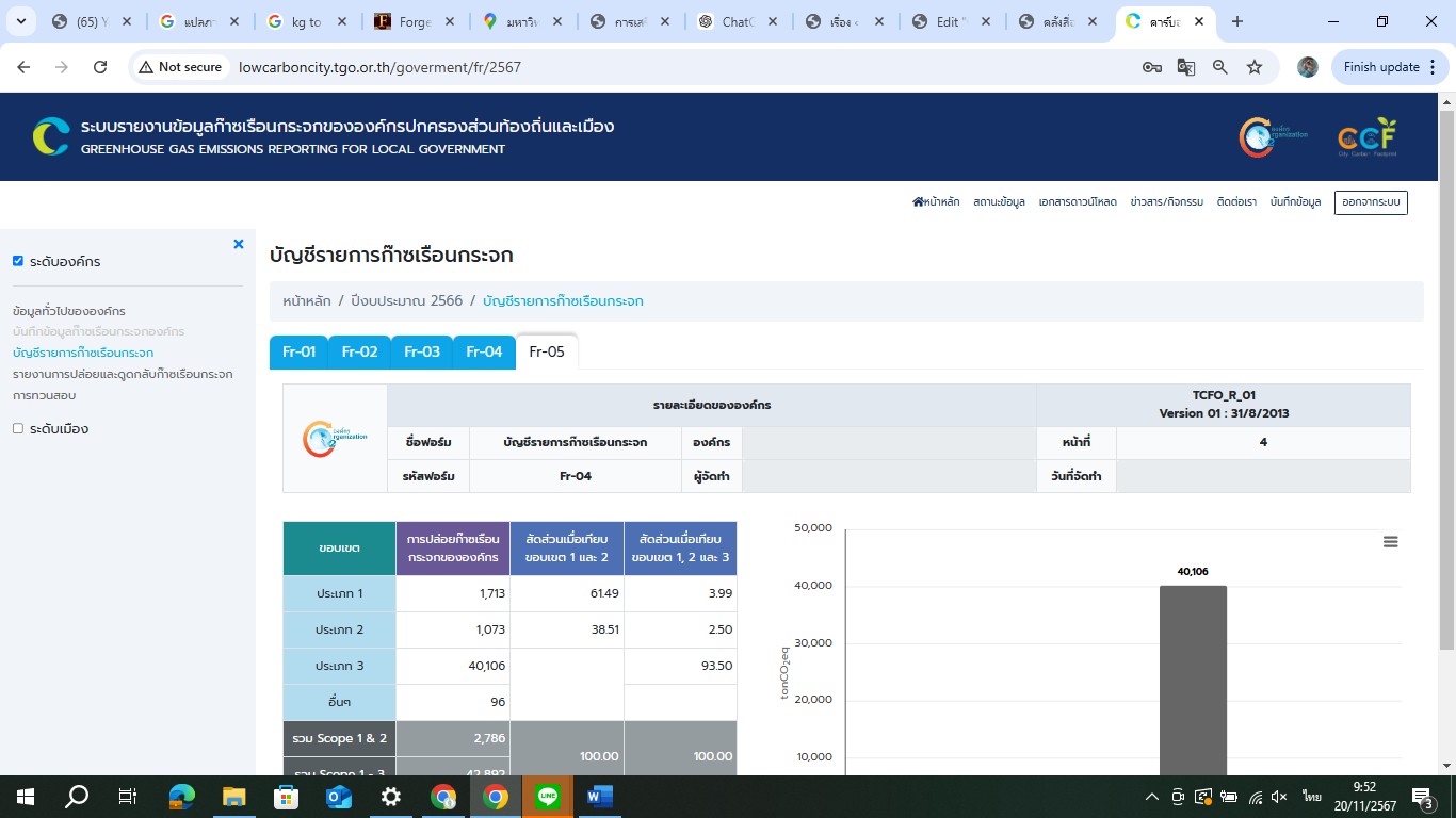 ![]() | 23-09-2025 | 50.00 | ประเมินสำนักงานเขตออกเป็น ๕ กลุ่ม ตามระดับความสมบูรณ์ของข้อมูลคาร์บอนฟุตพริ้นท์ รายละเอียดตามรูปที่แนบ สรุปได้ดังนี้ ๑) กลุ่มดีเยี่ยม (ความสมบูรณ์ของข้อมูลร้อยละ ๑๐๐) จำนวน ๖ สำนักงานเขต ได้แก่ สำนักงานเขตคลองสาน ทุ่งครุ บางคอแหลม พระนคร ยานนาวา และหลักสี่ ซึ่งมีปริมาณการปล่อยก๊าซเรือนกระจกหรือคาร์บอนฟุตพริ้นท์เฉลี่ย ๕,๒๔๒ ตันคาร์บอนไดออกไซด์เทียบเท่า (tCO2e)/สำนักงานเขต ๒) กลุ่มดีมาก (ความสมบูรณ์ของข้อมูลร้อยละ ๙๐ - ๙๙) จำนวน ๑๗ สำนักงานเขต ได้แก่ สำนักงานเขตคันนายาว จตุจักร ดุสิต ทวีวัฒนา บางแค บางกอกน้อย บางซื่อ บางนา บางบอน บางพลัด บึงกุ่ม ประเวศ พญาไท พระโขนง สัมพันธวงศ์ หนองแขม และห้วยขวาง ซึ่งมีปริมาณการปล่อยก๊าซเรือนกระจกหรือคาร์บอนฟุตพริ้นท์เฉลี่ย ๕,๓๕๗ tCO2e/สำนักงานเขต ๓) กลุ่มดี (ความสมบูรณ์ของข้อมูลร้อยละ ๗๐ - ๘๙) จำนวน ๑๒ สำนักงานเขต ได้แก่ สำนักงานเขตดินแดง ตลิ่งชัน ธนบุรี บางกอกใหญ่ ปทุมวัน ป้อมปราบศัตรูพ่าย ภาษีเจริญ ราชเทวี ลาดกระบัง วังทองหลาง สวนหลวง และสายไหม ซึ่งมีปริมาณการปล่อยก๊าซเรือนกระจกหรือคาร์บอน ฟุตพริ้นท์เฉลี่ย ๕,๓๕๘ tCO2e/สำนักงานเขต ๔) กลุ่มพอใช้ (ความสมบูรณ์ของข้อมูลร้อยละ ๕๐ - ๖๙) จำนวน ๑๐ สำนักงานเขต ได้แก่ สำนักงานเขตจอมทอง ดอนเมือง บางกะปิ บางขุนเทียน มีนบุรี ราษฎร์บูรณะ ลาดพร้าว วัฒนา สะพานสูง และสาทร ซึ่งมีปริมาณการปล่อยก๊าซเรือนกระจกหรือคาร์บอนฟุตพริ้นท์เฉลี่ย ๖,๐๐๐ tCO2e/สำนักงานเขต ๕) กลุ่มปรับปรุง (ความสมบูรณ์ของข้อมูลน้อยกว่าร้อยละ ๕๐) จำนวน ๕ สำนักงานเขต ได้แก่ สำนักงานเขตคลองเตย คลองสามวา บางเขน บางรัก และหนองจอก ซึ่งมีปริมาณการปล่อยก๊าซเรือนกระจกหรือคาร์บอนฟุตพริ้นท์เฉลี่ย ๖,๗๖๗ tCO2e/สำนักงานเขต | ||