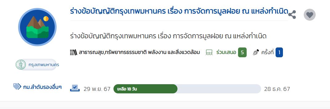 2 | คณะกรรมการฯ จัดทำร่างข้อบัญญัติกรุงเทพมหานครเกี่ยวกับการจัดการมูลฝอย ณ แหล่งกำเนิด เพื่อรับฟังความคิดเห็นของประชาชน | 20.00 | 01-10-2024 | 30-11-2024 |