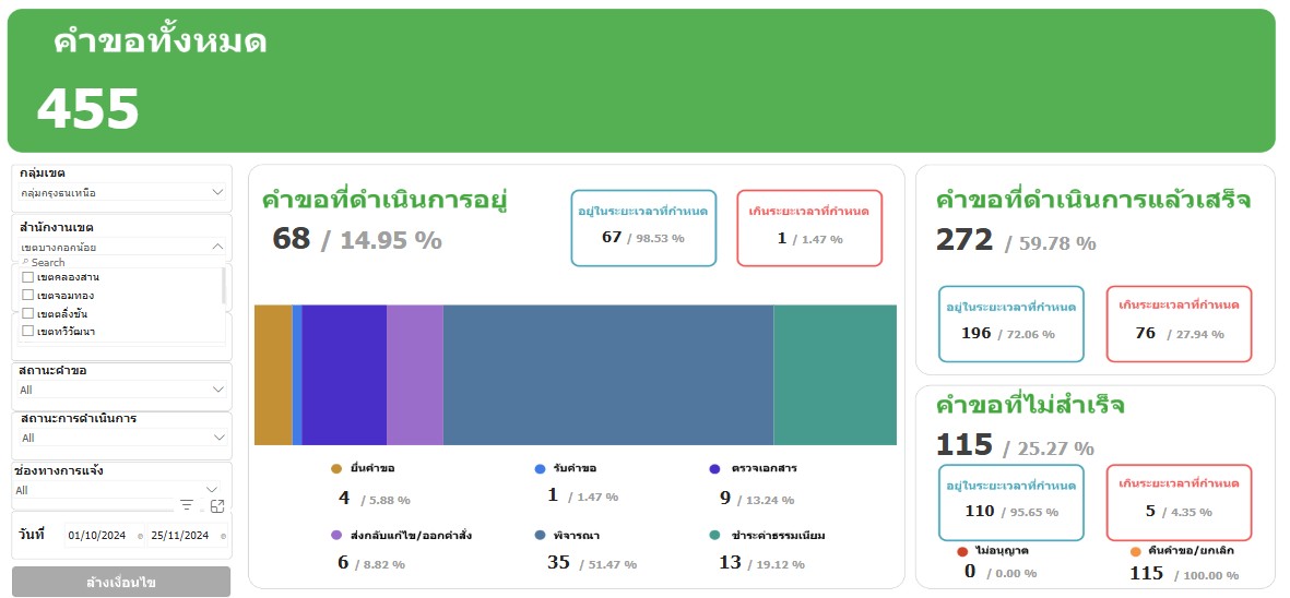 ![]() | 25-01-2025 | 0.00 | สำนักงานเขตบางกอกน้อย ดำเนินการตามมาตรฐานการบริการประชาชน ภายในระยะเวลาที่กำหนด คิดเป็นร้อยละ 85.37 โดยแบ่งเป็นผลการดำเนินงานในระบบ BMA OSS 32 กระบวนงาน ตั้งแต่ ธ.ค. 67 ถึง ม.ค. 68 คิดเป็นร้อยละ 90.23 และมีผลการดำเนินงานในการทำบัตรประชาชนที่จองคิวล่วงหน้าผ่านระบบ BMAQ ได้ภายในเดือนมกราคม 2568 คิดเป็นร้อยละ 80.51 | ||