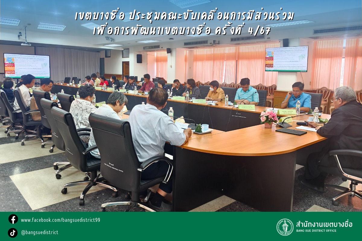 | 18-11-2024 | 0.00 |  | วันที่ 22 ตุลาคม 2567 ประชุมคณะขับเคลื่อนการมีส่วนร่วมเพื่อการพัฒนาเขตบางซื่อ ครั้งที่ 4/2567 ชี้แจงผลการดำเนินโครงการเฉลิมพระเกียรติพระบาทสมเด็จพระเจ้าอยู่หัว เนื่องในโอกาสมหามงคลเฉลิมพระชนมพรรษา 6 รอบ 72 พรรษา 28 กรกฎาคม 2567 และได้แลกเปลี่ยนพูดคุย แสดงความคิดเห็นเกี่ยวกับกิจกรรมในโครงการเฉลิมพระเกียรติพระบาทสมเด็จพระเจ้าอยู่หัวฯ ที่ได้จัดกิจกรรมขึ้น โดยไม่ใช้งบประมาณของทางราชการนั้น เป็นกิจกรรมที่สร้างสรรค์และส่งเสริมการพัฒนาในพื้นที่เขตบางซื่อเป็นอย่างดี พร้อมกันนี้ ได้มีการเสนอการดำเนินงานโครงการพัฒนาต้นแบบ BKK Food Bank ส่งต่ออาหาร ให้กลุ่มเปราะบางอย่างเป็นรูปธรรม , วัดคู่เมือง นโยบายประสานความสัมพันธ์ระหว่างบ้าน วัด และกรุงเทพมหานคร ส่งเสริมวัฒนธรรมอันดีงามในการทำนุบำรุงพระศาสนา | |