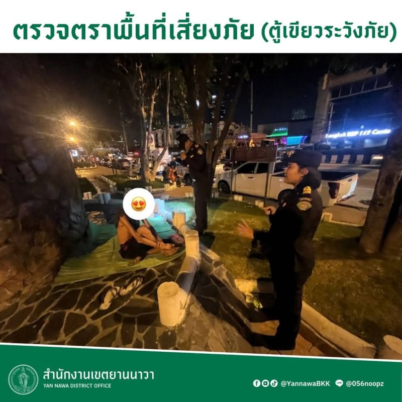 | 11-02-2025 | 2.00 |  | วันที่ 1 - 7 ก.พ. 68 นายสุวิน ชุมชัย หัวหน้าฝ่ายเทศกิจ เขตยานนาวา มอบหมายเจ้าหน้าที่เทศกิจชุดสายตรวจ 252 พร้อมเจ้าหน้าที่ฝ่ายรักษาความสะอาดฯ ลงพื้นที่สำรวจบุคคลไร้บ้านที่ได้เข้ามาพักอาศัยหลับนอน และจัดเก็บขยะและสิ่งของต่างๆ ที่อาจก่อให้เกิดแหล่งสะสมเชื้อโรค บริเวณถนนสาธุประดิษฐ์ เจ้าหน้าที่ได้แนะนำบุคคลไร้บ้านให้รับทราบถึงการบริการที่พักอาศัย เพื่อเข้าสู่กระบวนการแก้ไขปัญหาและการให้ความช่วยเหลือจากหน่วยงานของภาครัฐ รวมถึงแนะนำ ตักเตือนการกระทำใดๆที่ไม่ถูกต้องตามกฎหมาย โดยจะประสานไปยังหน่วยงานที่เกี่ยวข้องเพื่อส่งต่อให้ประชาชนได้รับความช่วยเหลือต่อไป ทั้งนี้ พี่น้องประชาชนสามารถร่วมช่วยเหลือบุคคลเหล่านี้ได้ โดยการแจ้งสายด่วน ศูนย์ช่วยเหลือสังคม (พม.) โทร.1300 ตลอด 24 ชม. | |