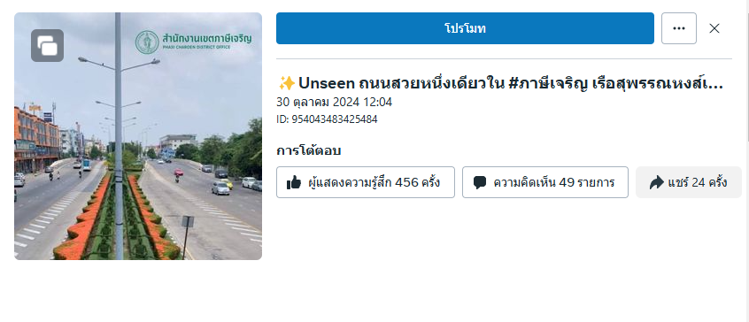 ![]() | 26-11-2024 | 30,145.00 | ![]() | จัดทำสื่อประชาสัมพันธ์ Unseen ถนนสวยหนึ่งเดียวใน #ภาษีเจริญ เรือสุพรรณหงส์เกาะกลางถนนพุทธมณฑสาย 1 ผ่านช่องทาง Facebook สำนักงานเขตภาษีเจริญ เมื่อวันที่ 30 ตุลาคม 2567 จำนวนการมีส่วนร่วมกับสื่อประชาสัมพันธ์ที่เผยแพร่ (Engagement) = 30,145 ครั้ง | |