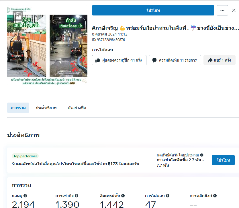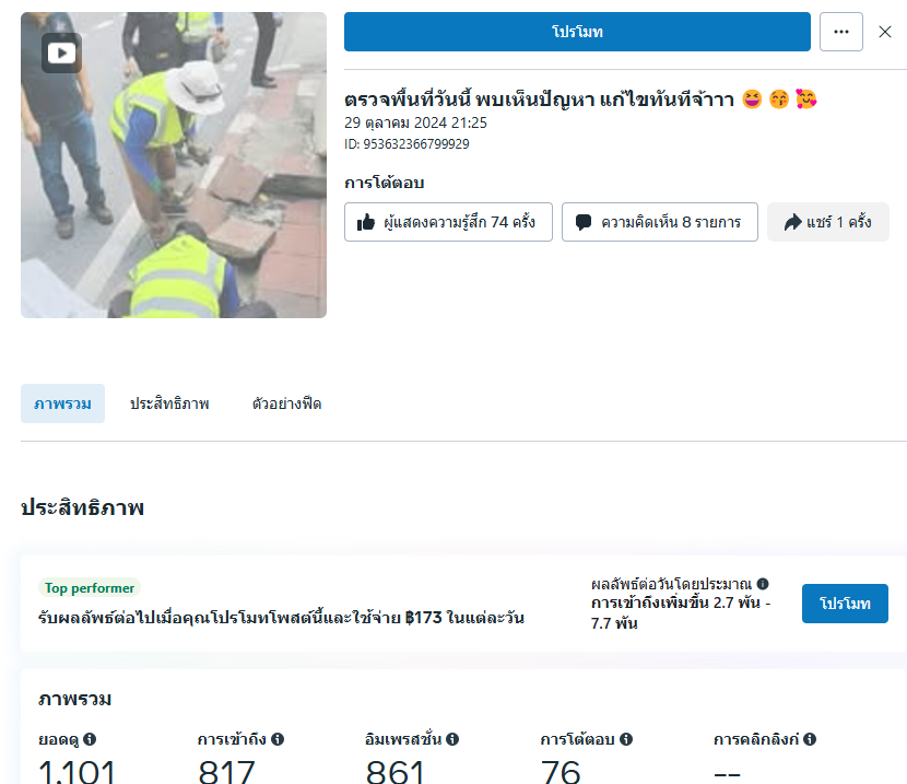 ![]() | 31-12-2024 | 989.00 | ![]() | จัดทำสื่อประชาสัมพันธ์ อินโฟกราฟิกประชาสัมพันธ์การปฏิบัติงานเจ้าหน้าที่ (เปลี่ยนฝาท่อชำรุด) ผ่านช่องทาง Facebook เมื่อวันที่ 4 ธันวาคม 2567 จำนวนการมีส่วนร่วมกับสื่อประชาสัมพันธ์ที่เผยแพร่ (Engagement) = 989 | |