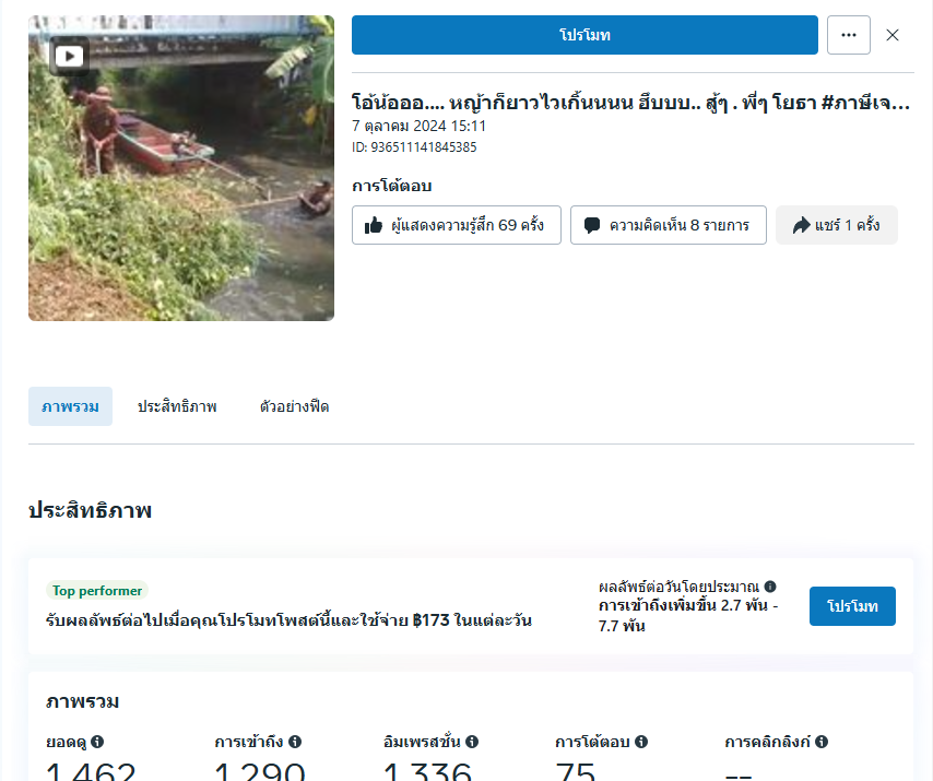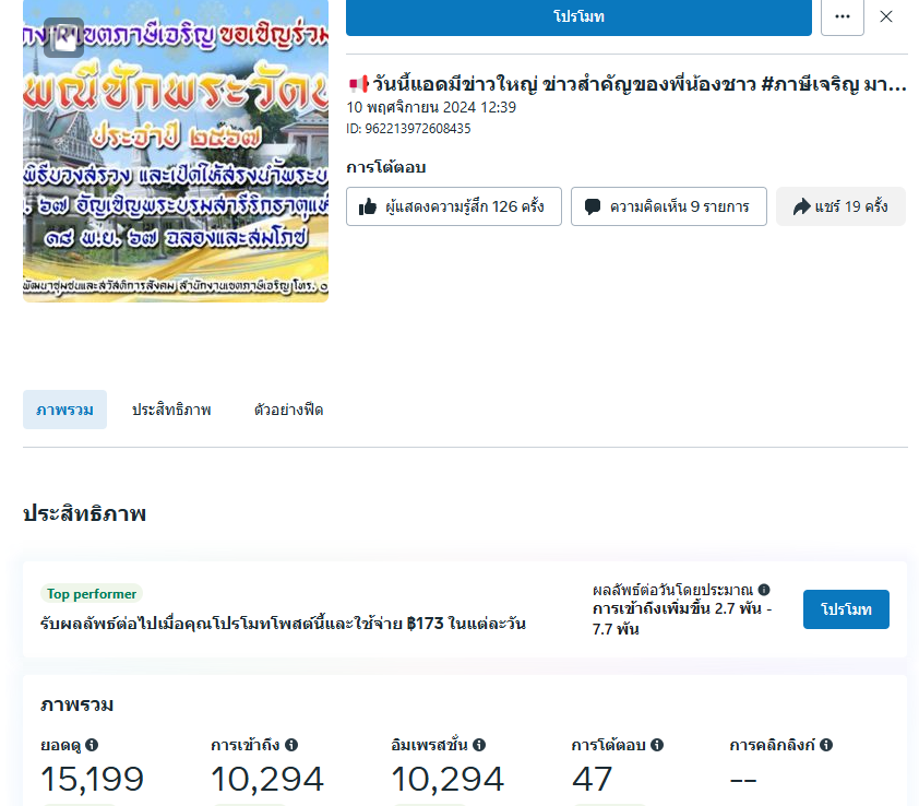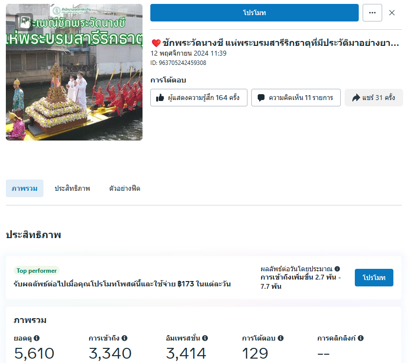 ![]() | 26-11-2024 | 5,739.00 | ![]() | จัดทำสื่อประชาสัมพันธ์ ประชาสัมพันธ์ประวัติประเพณีชักพระวัดนางชี ประจำปี 2567 ผ่านช่องทาง Facebook สำนักงานเขตภาษีเจริญ (พร้อมแนบลิงก์ Youtube) เมื่อวันที่ 12 พฤศจิกายน 2567 จำนวนการมีส่วนร่วมกับสื่อประชาสัมพันธ์ที่เผยแพร่ (Engagement) = 5739 | |